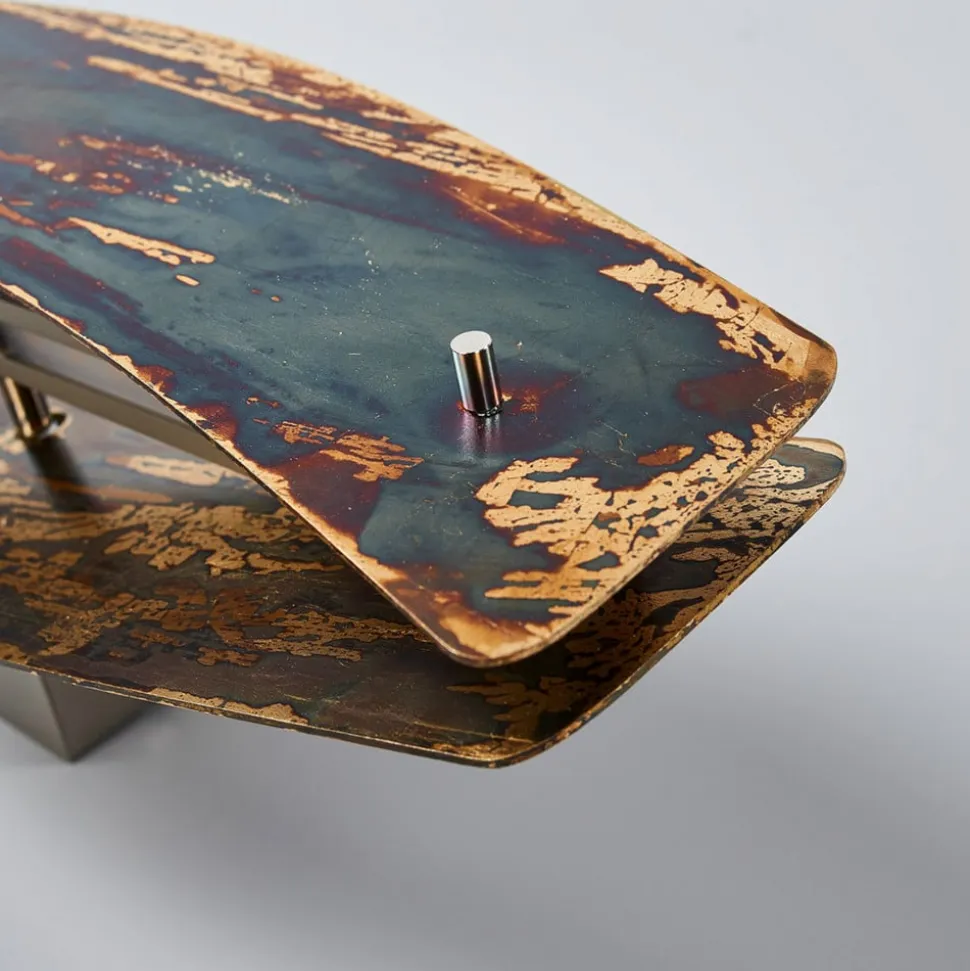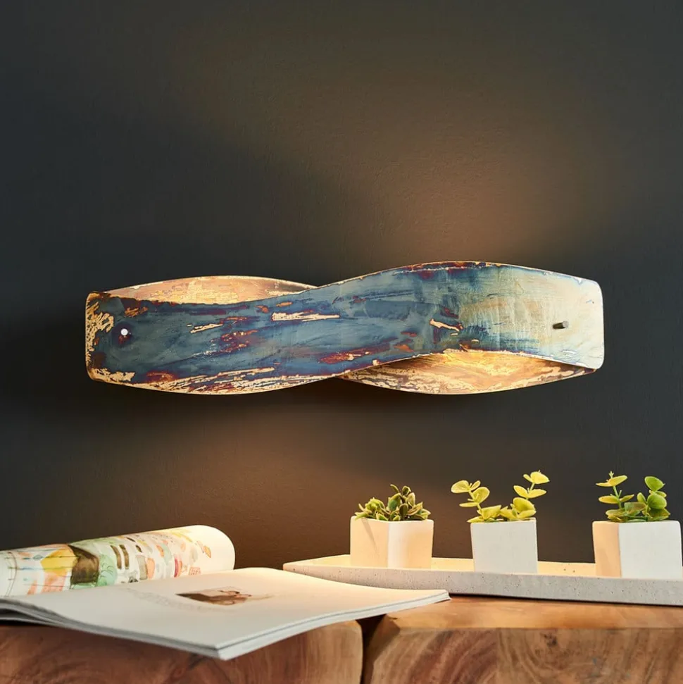 LED-væglampe Lian i et trendy rustlook – dæmpbar Looket på denne LED-væglampe Lian får vintagefans’ hjerter til at banke hurtigere! En meget speciel efterbehandlingsproces er ansvarlig for dette ekstraordinære look. Først og fremmest får de to buede aluminiumspaneler, der udgør væglampens skærm, en overfladebehandling i et skinnende guldlook. Panelernes overflade behandles derefter med en aktivator, som giver det underliggende materiale en ujævn mørk farve, hvilket resulterer i et konsekvent individuelt look. Denne proces, som udføres i hånden, garanterer et unikt stykke arbejde, da ikke to armaturer er ens med hensyn til deres overfladestruktur. Kvalitet er dog ikke kun vigtig for overfladefinishen, men også for den teknologi, der bruges i armaturet, som selvfølgelig også spiller en væsentlig rolle. Lyset fra LED’erne af høj kvalitet spredes jævnt opad og nedad på væggen. LED’erne, som har et imponerende farvegengivelsesindeks med en CRI-værdi på mere end 90, er placeret bag satinbehandlede diffusorer, der gavner den ensartede lysfordeling. Ved hjælp af en passende lysdæmper (en leading edge- eller trailing edge-fasedæmper anbefales) kan lysstyrken på Lian også justeres trinløst, så armaturets lysudbytte altid kan tilpasses de gældende forhold. Et garanteret blikfang med et vintage-look, der kan meget mere end bare at give lys!