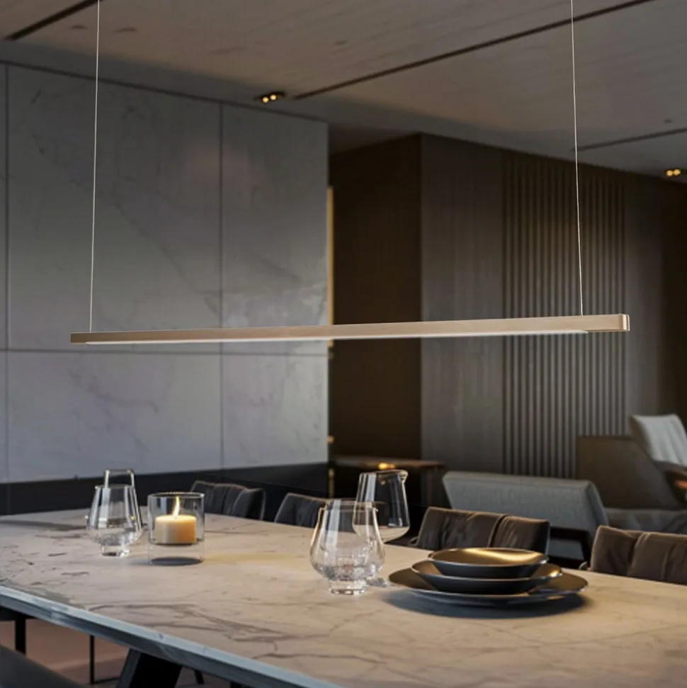 Lang Talon LED-hængelampe i aluminium med CCT og dæmpningsfunktion Med sin lange og ekstremt smalle form er Talon LED-hængelampen ideel til belysning af lange stue-, spisestue- eller køkkenborde. Takket være det diskrete farvedesign i lys bronze passer den nemt ind i forskellige boligområder og indretningsstile. Talon er fremstillet af aluminium, messing og akryl. Den anodiserede overflade er omhyggeligt udformet i hånden. Den har en særlig beskyttende belægning, der forhindrer den naturlige oxidering af metallet. Pendellampen er derfor meget robust og holdbar. Talon er praktisk udstyret med en bevægelseskontrol, der gør det muligt at regulere lysstyrken. Farvetemperaturen kan også justeres trinløst fra varmhvid til universalhvid. Lysets højde er også variabel. Det betyder, at man på ingen tid kan skabe de rette lysforhold til enhver situation.