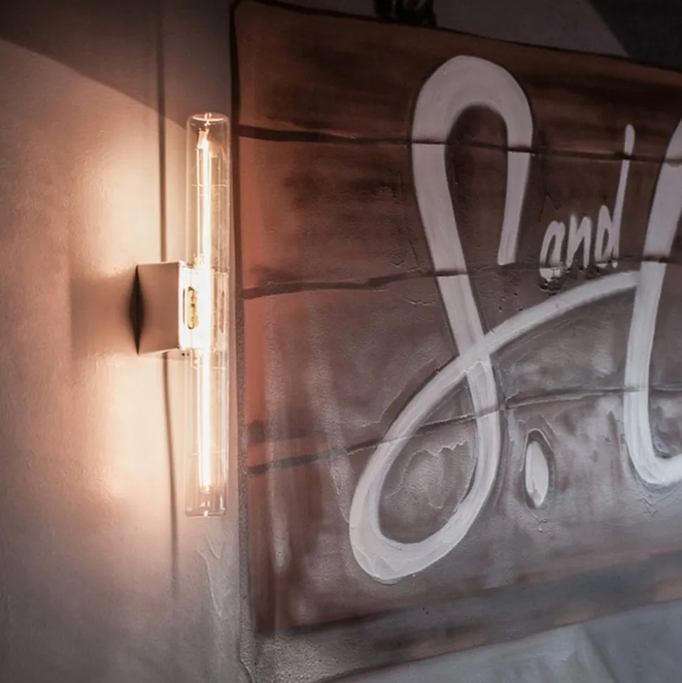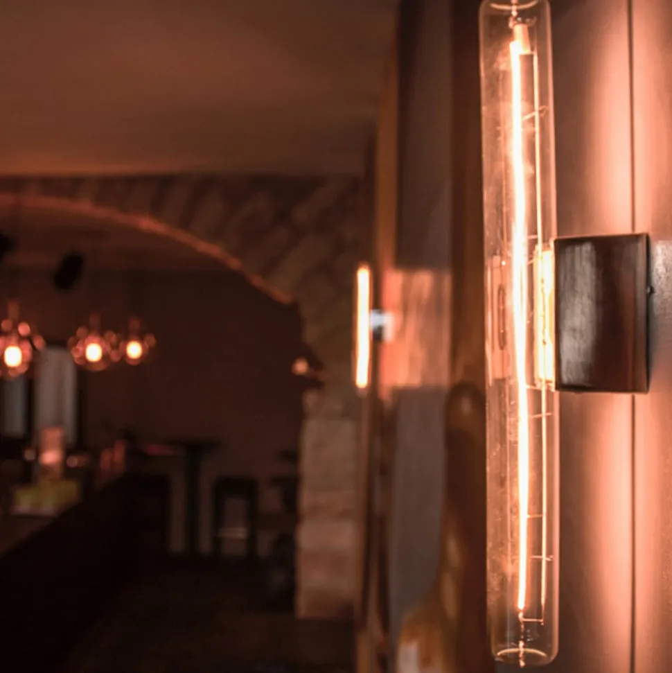 Den sorte vægbeslag lavet af metal er minimalistisk og reduceret til det væsentlige. Det er rektangulært og er simpelthen fastgjort til væggen. Størstedelen af denne væglampe er en S14d- fatning. Den anvendte lyskilde kommer til sin ret takket være den enkle holder, fordi intet vil distrahere fra lyseffekten og den elegante lineære lampe.