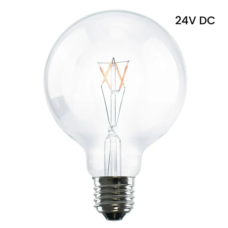 LED-globepære E27 3W glødetråd 2.700K til 24V-nettet Denne LED-globepære er en del af Nautic Line fra Segula, en lampeserie, der er specielt udviklet til direkte brug i 24V-nettet. Denne netspænding findes f.eks. i autocampere eller på husbåde. Den klare globepære lyser i en behagelig varmhvid lysfarve og kan dæmpes. Den er udstyret med ambient dimming, som reducerer farvetemperaturen, når den er dæmpbar (fra 2.700 K ved fuld lysstyrke til 2.000 K, når den er dæmpet).