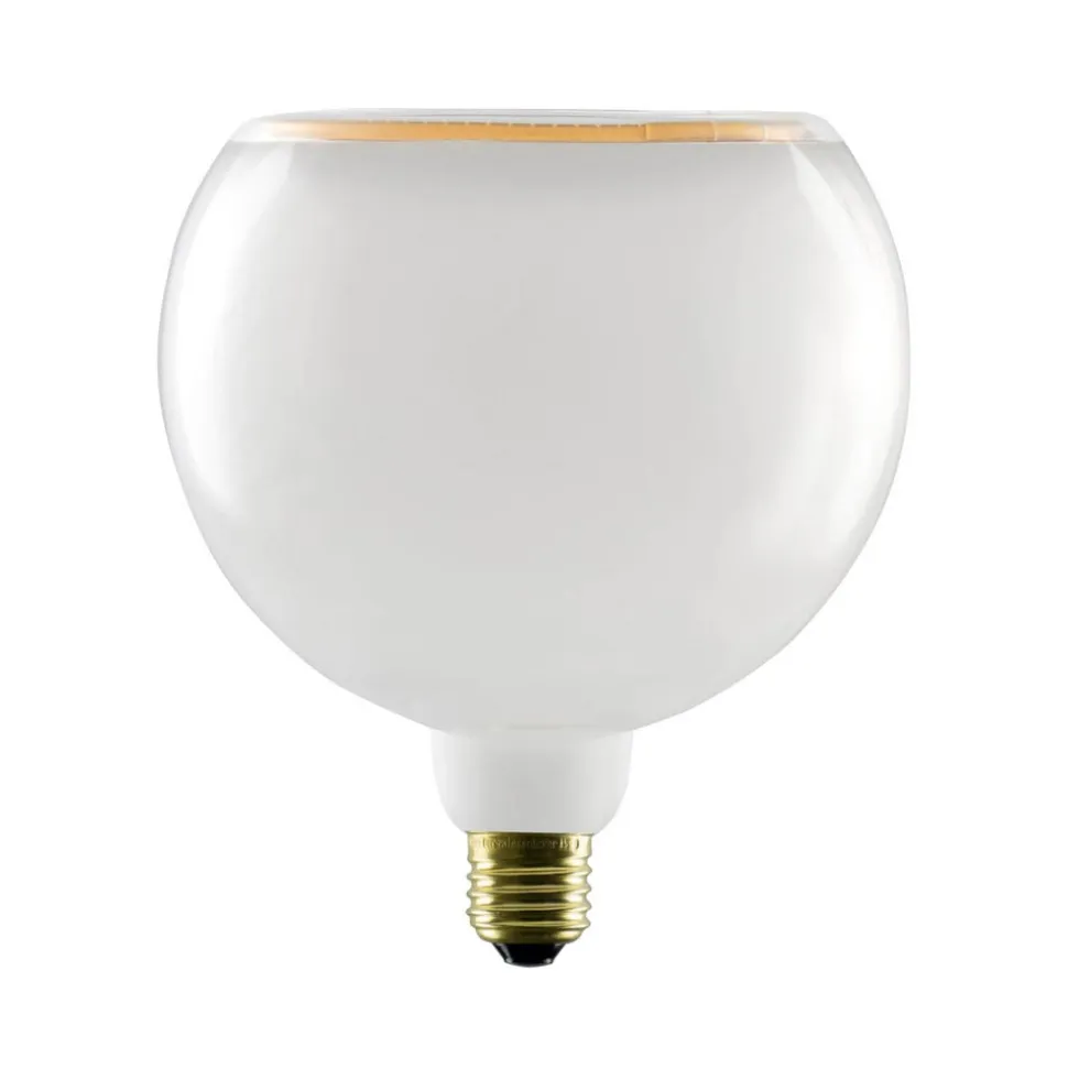 E27 LED-pære Floating, Ø 15 cm, 6 W, hvid glaspære Denne E27 LED-pære fra Floating-serien er udstyret med en hvid glaspære i en stor G150-kugleform, som er åben i den modsatte ende af foden. Dioderne er integreret i den ringformede åbning. E27-metalsoklen har guldfinish, og den patenterede soft filament-teknologi og attraktive lysrefleksioner giver pæren ekstra dekorativ værdi. Ideel til åbne armaturer uden skærm eller fatningsarmaturer – eksternt dæmpbar (bagkant) – ekstra varmhvidt lys – god farvegengivelse (CRI 90) – håndlavet glaskolbe