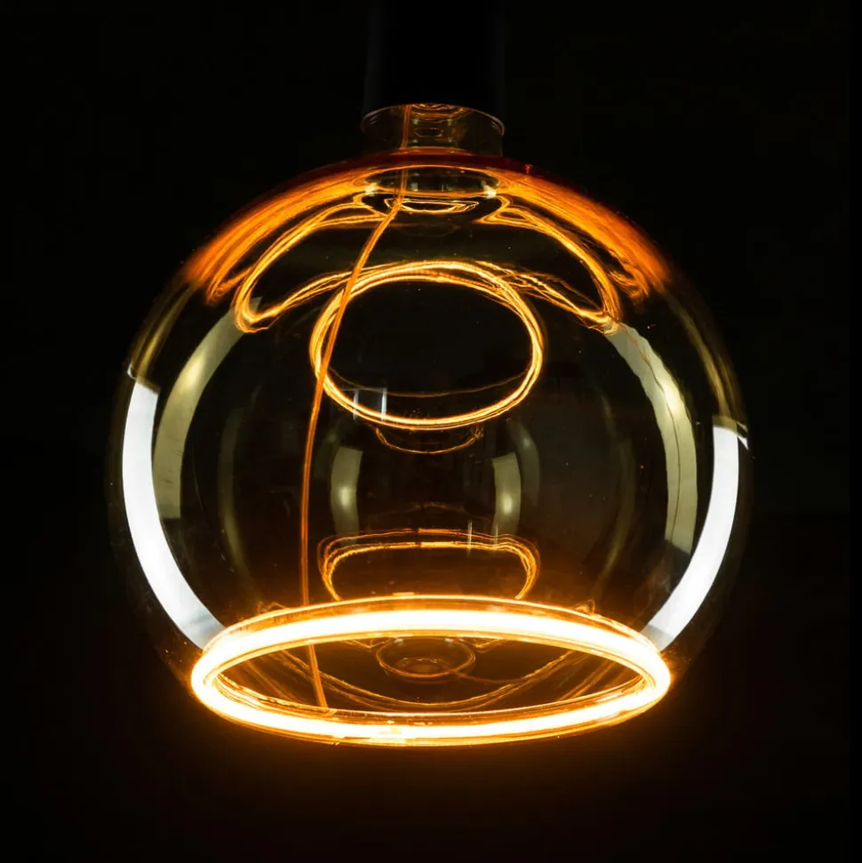 LED-globepære G150 Floating E27 4W guld dæmpbar Denne globepære fra Floating-serien fra Segula er lavet med et dobbeltvægget glas med en gylden farvetone og en patenteret LED-soft filament indbygget i det som en ring. Dette skaber indtrykket af svævende lys, hvilket gør denne armaturserie så speciel og den ideelle lyskilde til alle skærmløse armaturer – varm lysfarve med 2.200 K – dæmpbar med f.eks. ELTAKO, Jung, GIRA – meget god farvegengivelse Ra 90 – tildelt Plus X Award 2022/2023 i kategorierne innovation, høj kvalitet og design