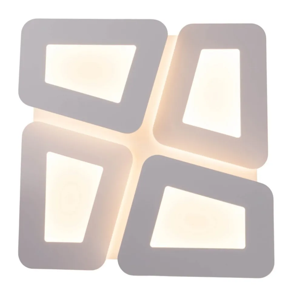 Hvid Simes LED-loftlampe med CCT-funktion – styres med fjernbetjening Simes LED-loftlampe i hvid er en funktionel og visuelt moderne lyskilde til opholdsrummet. Fire kantede elementer i forskellige retninger er monteret under et firkantet loftsarmatur i metal. De rummer hver især en LED-lyskilde med en diffuser på undersiden, og lyset spotlightes også opad, hvilket skaber en behagelig grundbelysning. Lysfarven kan justeres fra varmhvid til dagslys afhængigt af situationen, og lysstyrken kan også justeres. Når lyset tændes igen, genaktiveres den sidst valgte indstilling (hukommelsesfunktion). Der findes en natlampe-funktion til diskret orienteringsbelysning. Alle indstillinger kan styres med den medfølgende radiofjernbetjening (frekvens: 2,4 GHz).