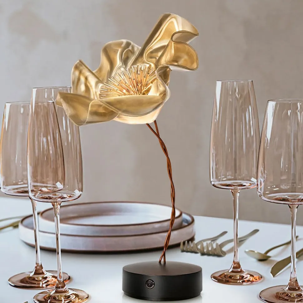 LaFleur – den ekstraordinære LED-bordlampe i form af en gylden blomst Som navnet antyder, er dette kunstværk modelleret efter en blomst. Blomsten er støbt i hånden, hvilket gør den lige så unik som enhver naturlig plante. Lentiflex®-materialet af høj kvalitet er udviklet af den italienske producent Slamp selv og imponerer med sin robusthed, elegance og kvalitet. Det skinner i en gylden farve og giver lyset en særlig varme. Skærmen er modelleret som et bæger og er åben i toppen. Blomsterne danner et dristigt hoved og omgiver de diskrete, stavformede pistiller i midten. Den smukke blomst støttes af en robust, fleksibel, flettet kobbertråd, der skinner i en mørkerød farve og er fastgjort til en matsort base. Der medfølger en magnetisk skive, som f.eks. kan placeres under en dug for at give bordlampen en stabil base, men den kan også monteres på væggen, hvilket demonstrerer denne lampes fleksibilitet. Der er indbygget et genopladeligt batteri i LaFleur bordlampen, som har en driftstid på 6,5 timer og kan oplades via en integreret USB-port. Der er også indbygget en berøringsdæmper i foden, som kan bruges til at justere lysstyrken efter ønske – batterilevetid 6,5 timer ved maksimal effekt – 60 timer ved minimal intensitet – opladningstid 5 timer – trinløs dæmpbar via berøringsdæmper Den italienske producent Slamp står for høj kvalitet og et selvstændigt og kreativt design, der altid er kendetegnet ved det unikke. Siden 1994 har anerkendte designere og arkitekter udtænkt, skåret og formet dekorative designerlamper, hvoraf nogle er fremstillet af patenterede materialer.