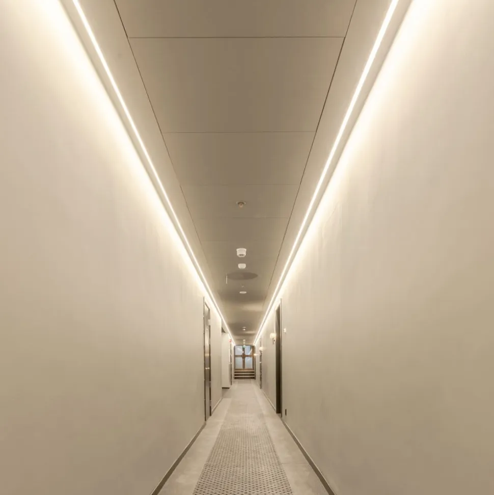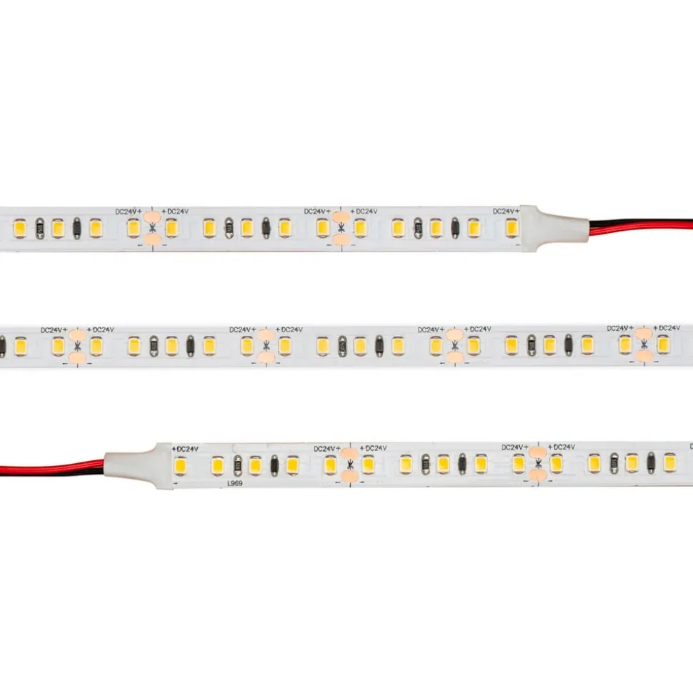 LED-strip Ultra Long iCC, 30 m, til tørre miljøer Lange korridorer på f.eks. hoteller kan belyses tilstrækkeligt med denne LED-strip. I alt 30 m, som kan afkortes efter behov, er inkluderet her og kan forsynes via et enkelt kontroludstyr. Takket være de indbyggede transistorer forbliver spændingen og lysstyrken konstant over hele længden. 3M-klæbebåndet på bagsiden gør installationen lettere. Montering i en profil anbefales for effektiv køling og for at sikre en lang levetid – Kapslingsgrad: IP20 – Kræver spændingsstyret LED-kontrolgear 24 V DC (medfølger ikke) – Kan opdeles i 5 LED’er (4,17 cm) – Med 2 m lange tilslutningskabler (2-polet, ledertværsnit 0,35 mm²) – Omgivelsestemperatur under drift: – 20 °C til + 45 °C