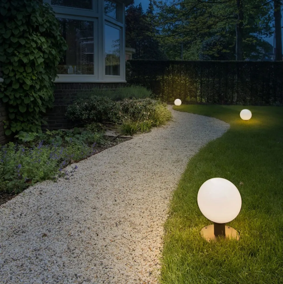 Tidløs smuk Gloo Pure sokkellampe Denne lille sokkellampe med et lavt stel af antracitfarvet, lakeret aluminium imponerer med sit sfæriske, satinbelagte lysglas, som giver et stemningsfuldt lys, der skinner i alle retninger. Det betyder, at kanter på blomsterbede, mure og trapper ikke bliver farlige snubletråde i mørket. Et æstetisk armatur, der også pryder ejendommen om dagen.