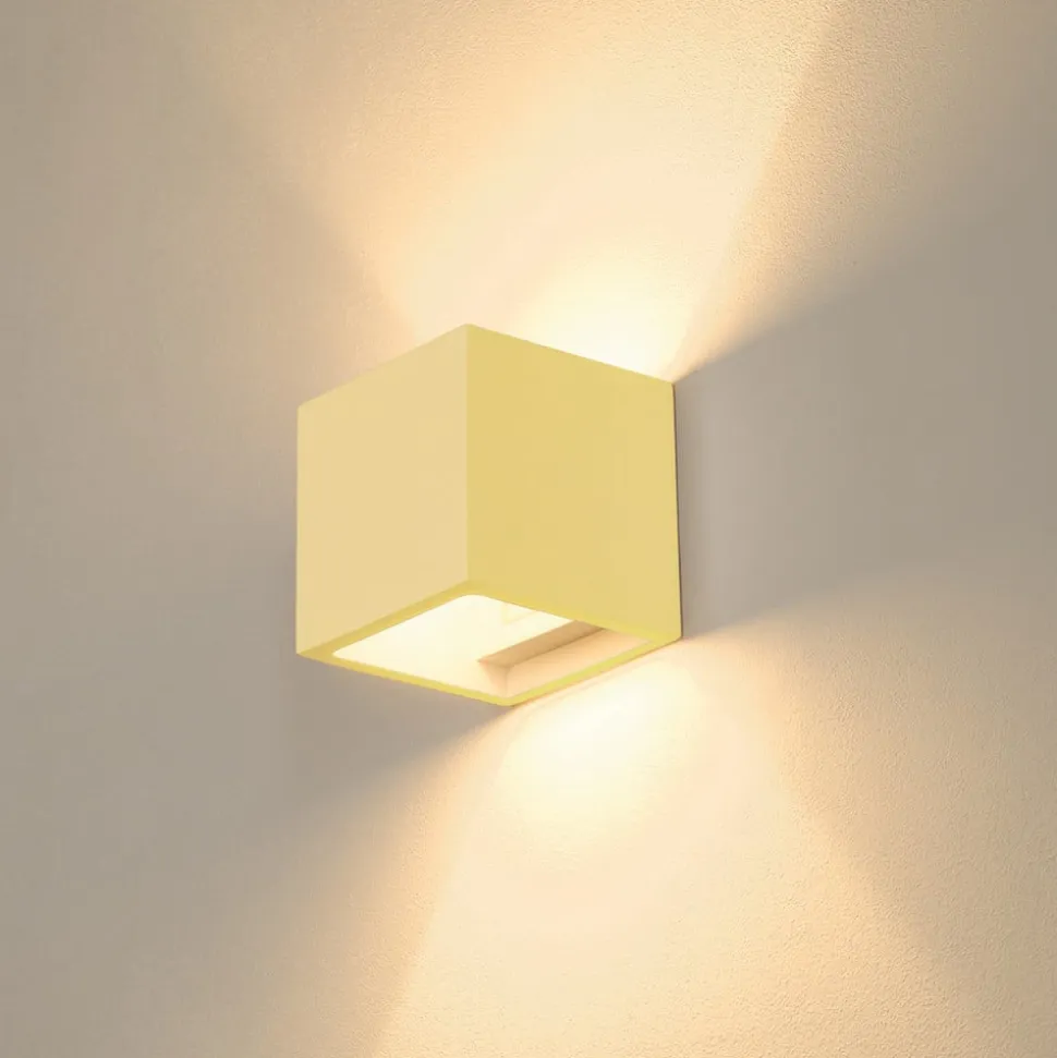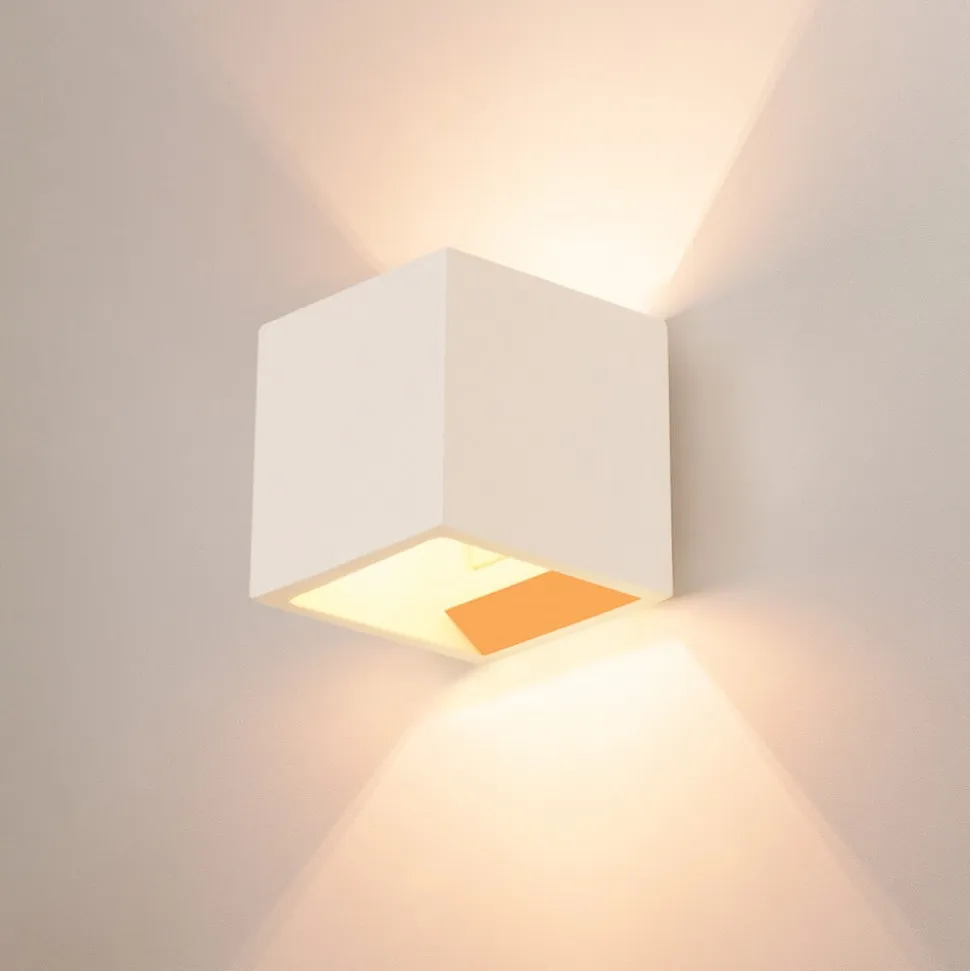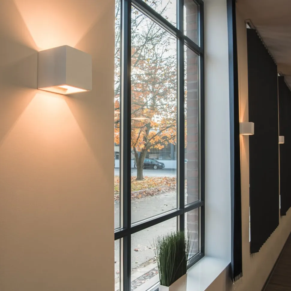 Kubeformet Plastra væglampe lavet af gips Skærmen på den hvide Plastra væglampe, som skiller sig ud med sit minimalistiske design, er lavet af gips. Plastra giver en effektiv ekstra belysning og kan males over (efter grunding) med en standard vægfarve, så den passer til interiøret. Det medfølgende sandpapir bruges til at fjerne snavspartikler – eksternt dæmpbar