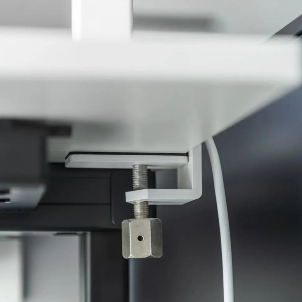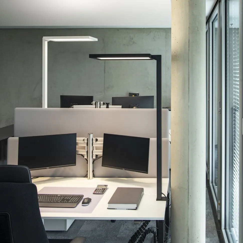 Allrounder på kontoret: Worklight LED-skrivebordslampe, der kan klemmes fast Worklight LED-klemmelampen kan placeres variabelt og pladsbesparende takket være klemmefastgørelsen til bordtykkelser på 0,6 til 4 cm. Aluminiumsrammen bærer et fladt, rektangulært hoved med integrerede LED’er. Deres universelle hvide lys udsendes over et stort område opad og nedad og giver omfattende omgivelses- og arbejdsbelysning. Den lave blændingseffekt gør den også velegnet til brug ved computerarbejdspladser på kontorer. Ud over betjening via touch-modulet på rammen er der også mulighed for automatisk styring. Til dette formål er Worklight udstyret med en bevægelses- og dagslyssensor, der skifter armaturet baseret på tilstedeværelsen af mennesker og regulerer lysudgangen baseret på den omgivende lysstyrke – God blændingskontrol: UGR < 19 – Bevægelsesdetektor: passiv infrarød – Slagfasthed: IK02