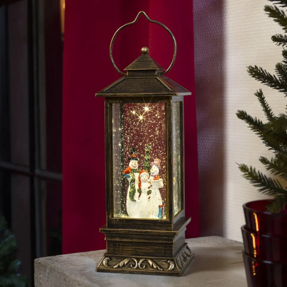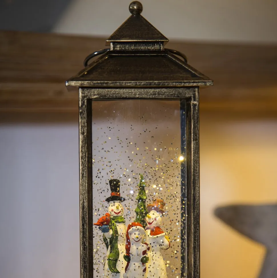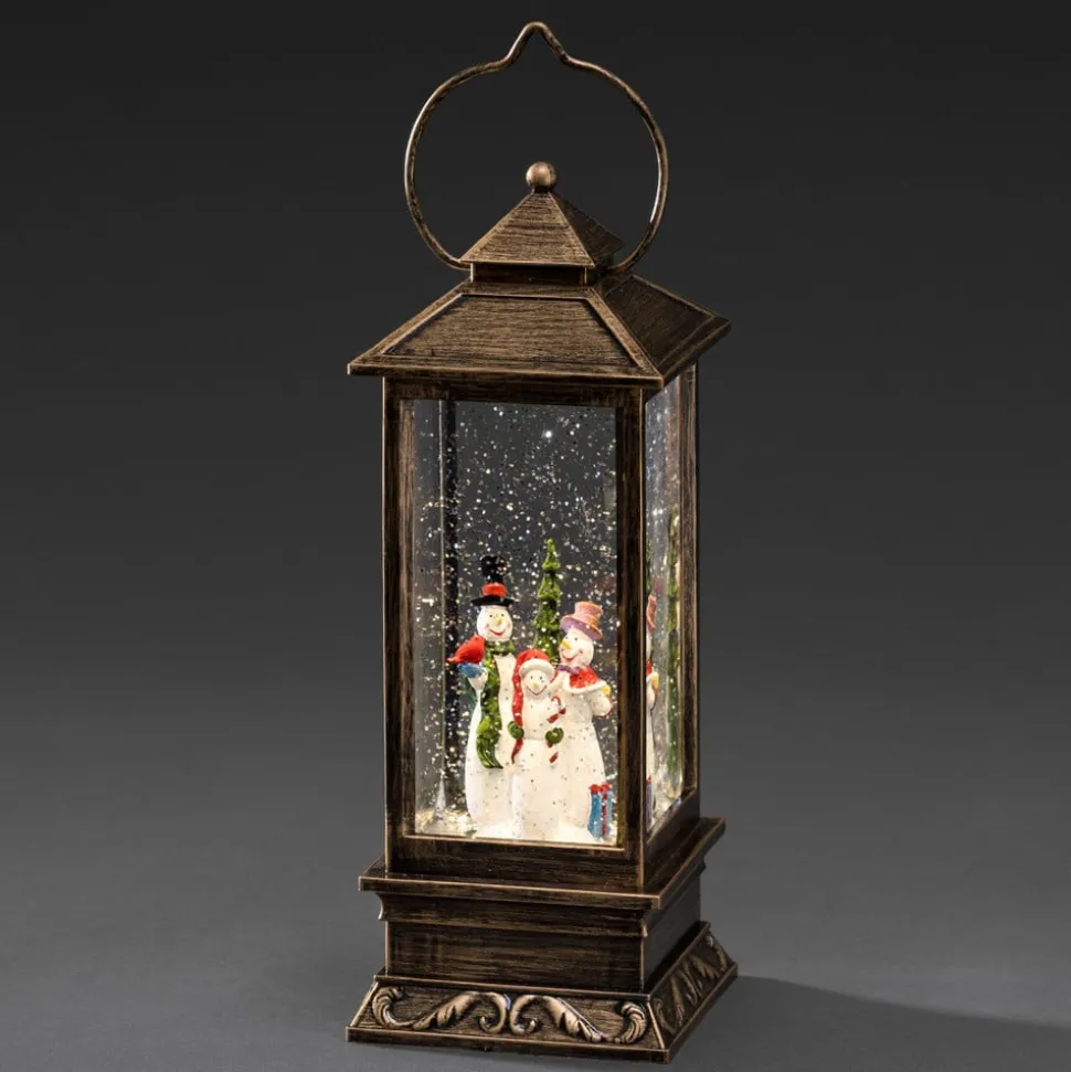 Denne flotte lanterne er designet ligesom de kendte og værdsatte snekugler: Den er fyldt med vand, hvori man ser et dekorativt vinterlandskab med snemænd og juletræ. Snefnug hvirvles omkring og oplyses af et varmhvidt skinnende LED-lys. Batterierne medfølger ikke ved leveringen (kan fås under tilbehør).