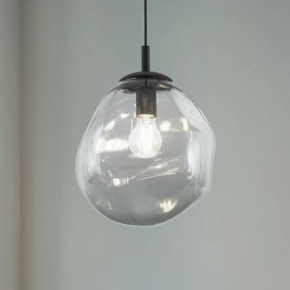 Sol Mini pendel med grafitgrå tonet græsskærm og sort ophæng Sol Mini pendel med ét lys er et blikfang i moderne stuer og lounges. Det sorte ophæng med rund baldakin holder en rund, uregelmæssigt bølget glasskærm. Den er transparent grafitgrå og giver udsyn til den lyskilde, der skal bruges.