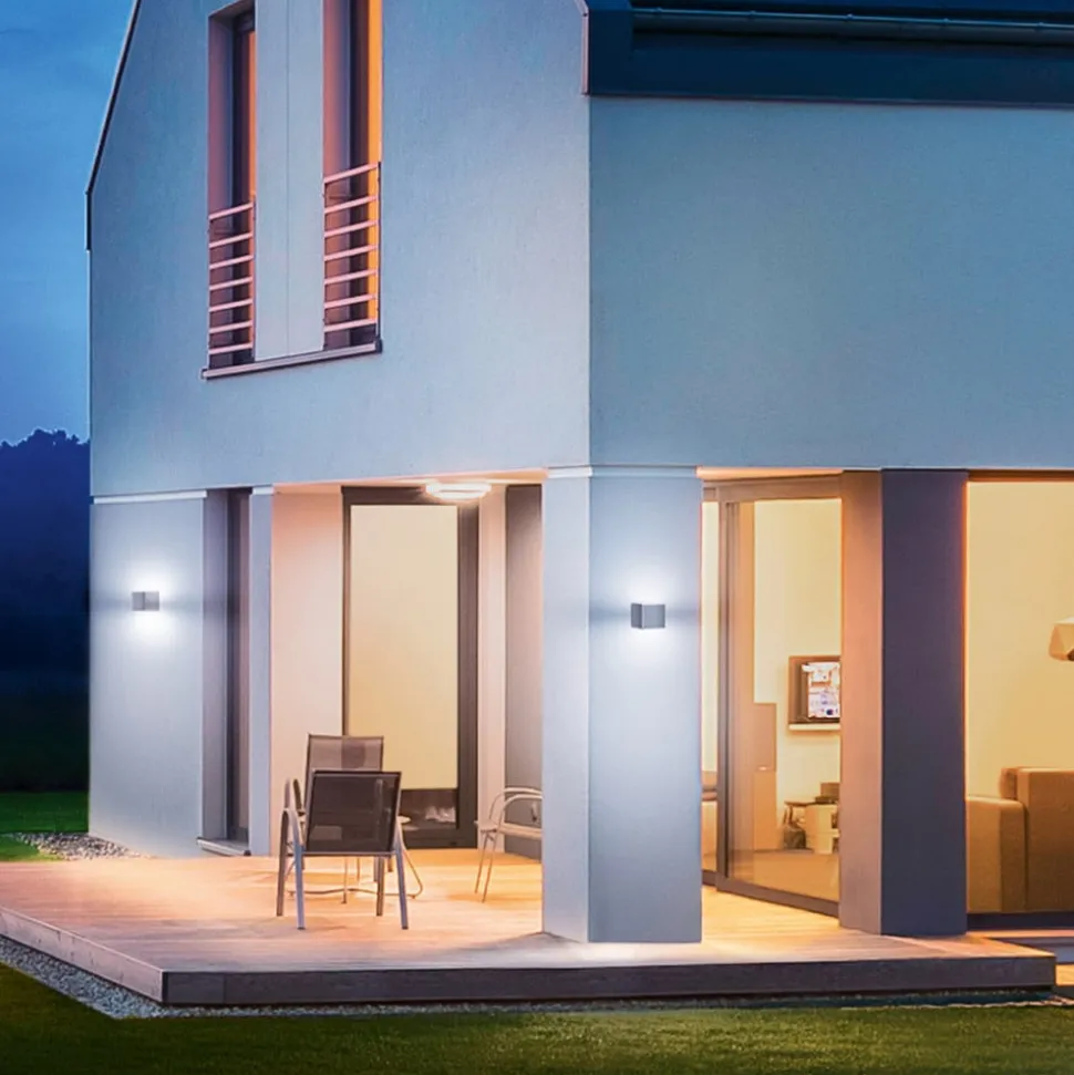STEINEL Connected Lighting – LED udendørs-væglampe L 830 SC med integreret sensor Den kubeformede LED udendørs-væglampe L 830 SC er udstyret med en intelligent højfrekvenssensor, der kun reagerer på menneskelig bevægelse og ignorerer bevægelser fra små dyr eller blade, der bevæger sig i vinden. Den har en registreringsvinkel på 160° og en rækkevidde på 5 m. Den udendørs LED-væglampe udsender varmhvidt lys, der spotlightes opad, fremad og nedad gennem den satiniserede diffusor. Den udendørs væglampe er Bluetooth-aktiveret og kan integreres i WLAN-netværket og dermed styres smart via den gratis STEINEL-app (til Android og iOS). Tekniske data: – Konfiguration udelukkende med STEINEL Connect-appen – Rækkevidde justerbar 1 – 5 meter – Lysstyrke kan vælges 2 – 2000 lux – Lysets varighed kan justeres fra 5 sekunder til 60 minutter – 4 timers kontinuerligt lys kan justeres – Grundlysfunktion kan justeres i 10 minutter, 30 minutter, hele natten – Monteringshøjde maks. 2,5 m