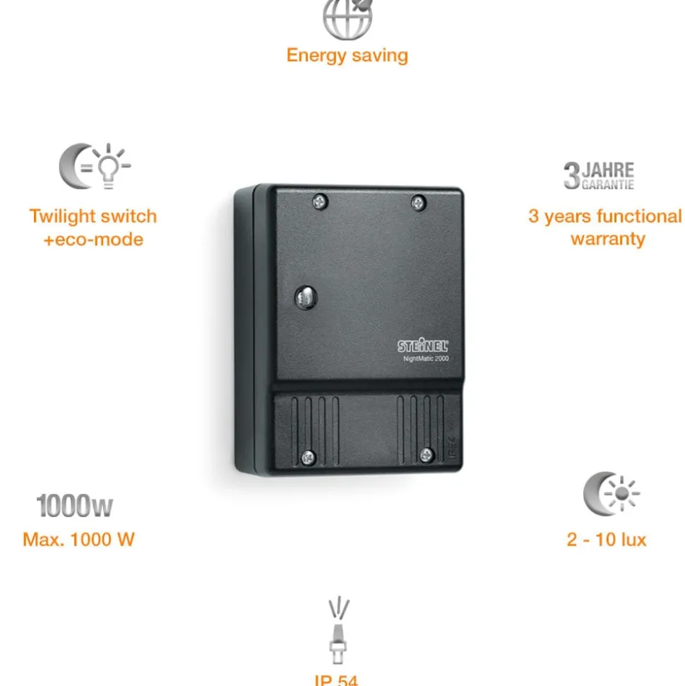 NightMatic 2000 registrerer den omgivende lysstyrke og tænder automatisk de tilsluttede armaturer om aftenen, når skumringsgrænsen er nået, og slukker igen ved daggry.