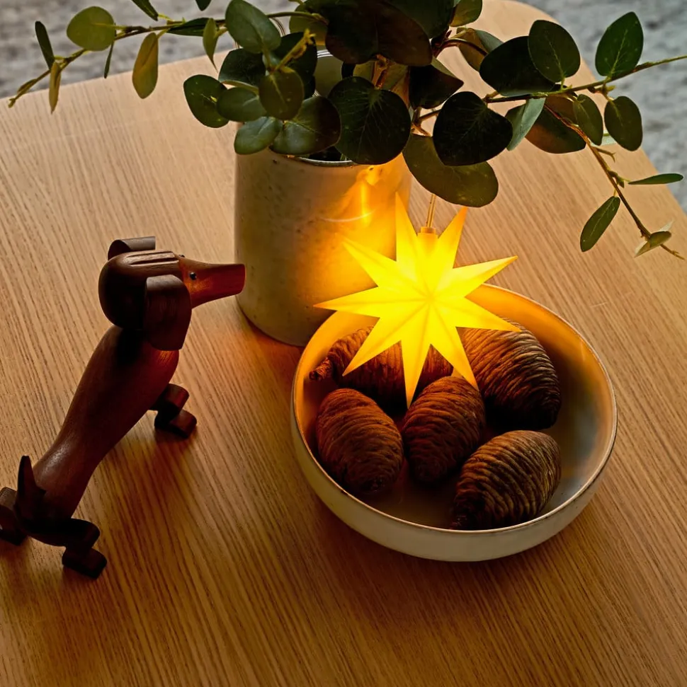 Den 9-takkede LED-stjerne af plast er velegnet til dekoration indendørs og udendørs samt til vinduer. Batteridrift: 3 x AA-batterier (medfølger ikke). Udstyret med timer. Ledningen til batterirummet er diskret og gennemsigtig.