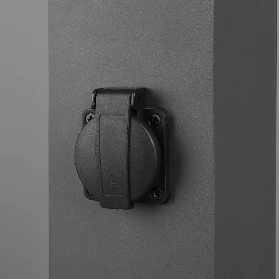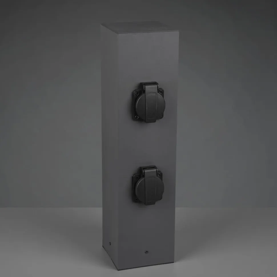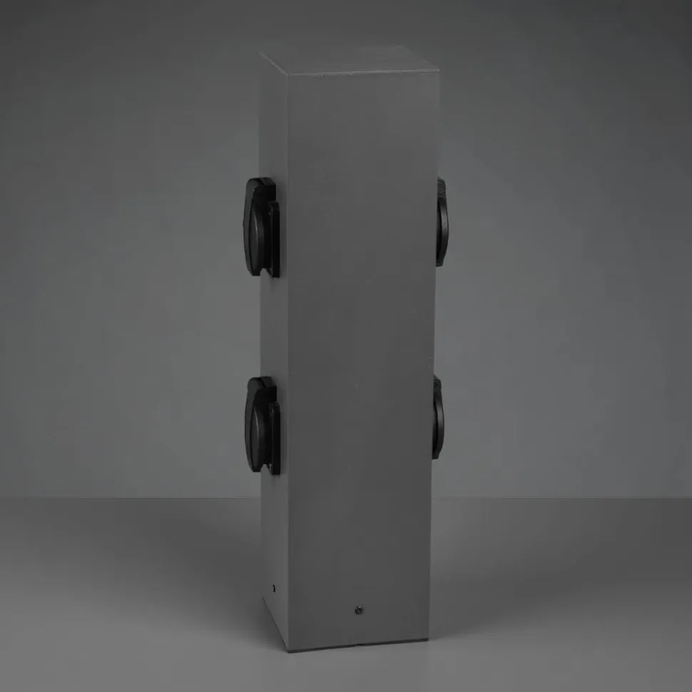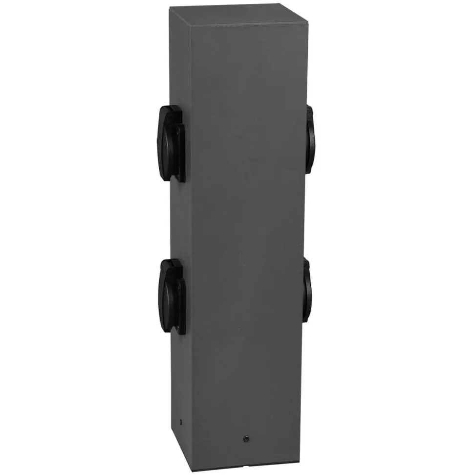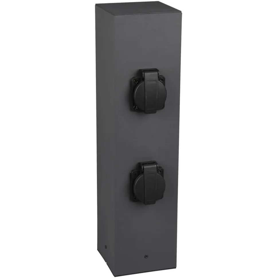 4-vejs stikkontaktsøjle Bollard til udendørs brug Stikkontaktsøjlen Bollard i metal har fire stikkontakter med beskyttelsesklapper (2 x 2 på modsatte sider) til forsyning af elektrisk styrede enheder i udendørsområdet. Søjlen har et visuelt neutralt kubisk design i mørk antracit – Beskyttelsesklasse: IP44 – Maksimal samlet effekt af de betjente belastninger: 3600 W, 16 A