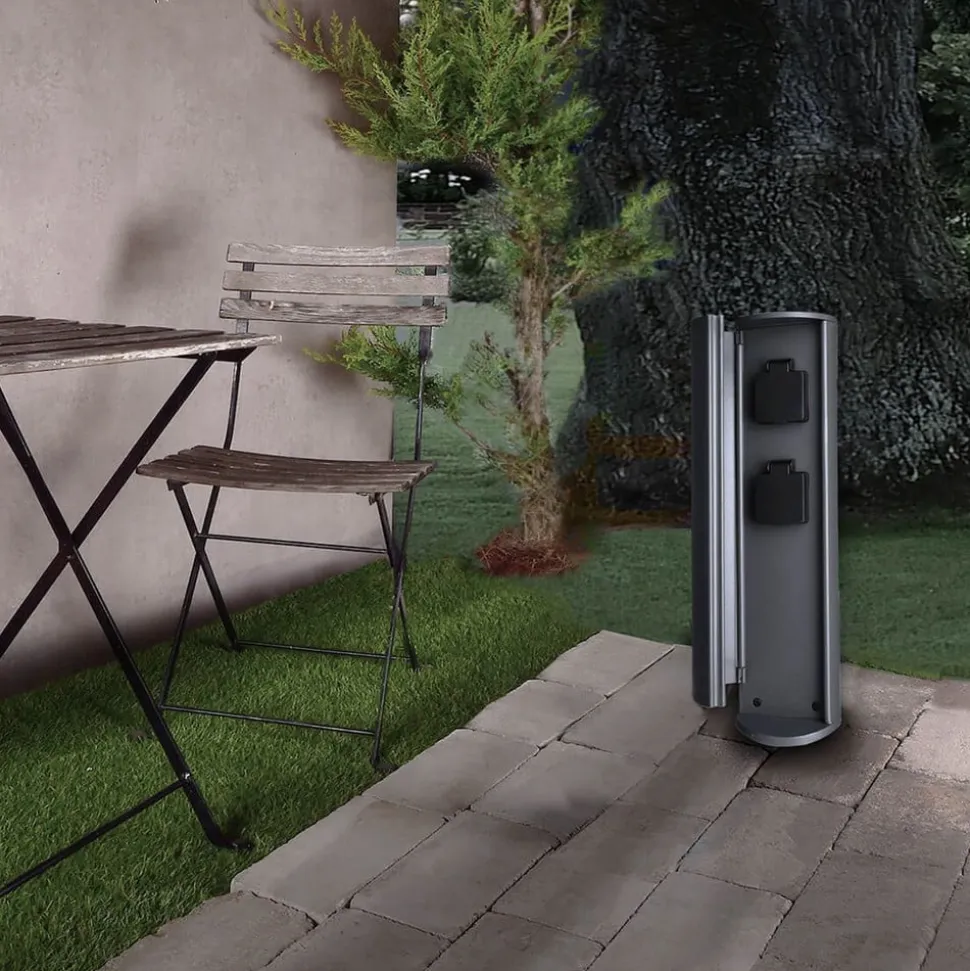 Denne stikkontaktsøjle har et moderne design og fås i farven mørkegrå. Den er fremstillet af robust støbt aluminium og har to stik til tilslutning og betjening af elektriske apparater. Takket være IP44-beskyttelsen kan stikkontaktsøjlen uden problemer anvendes udendørs.