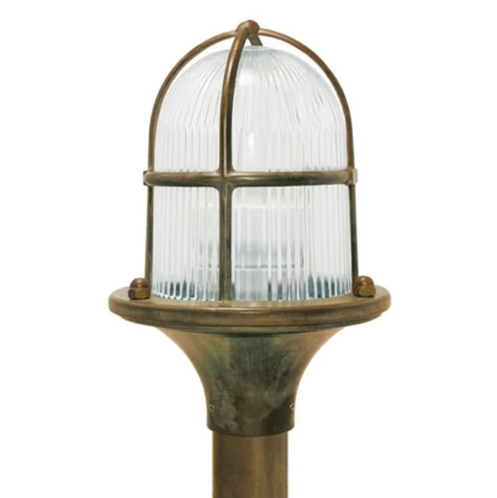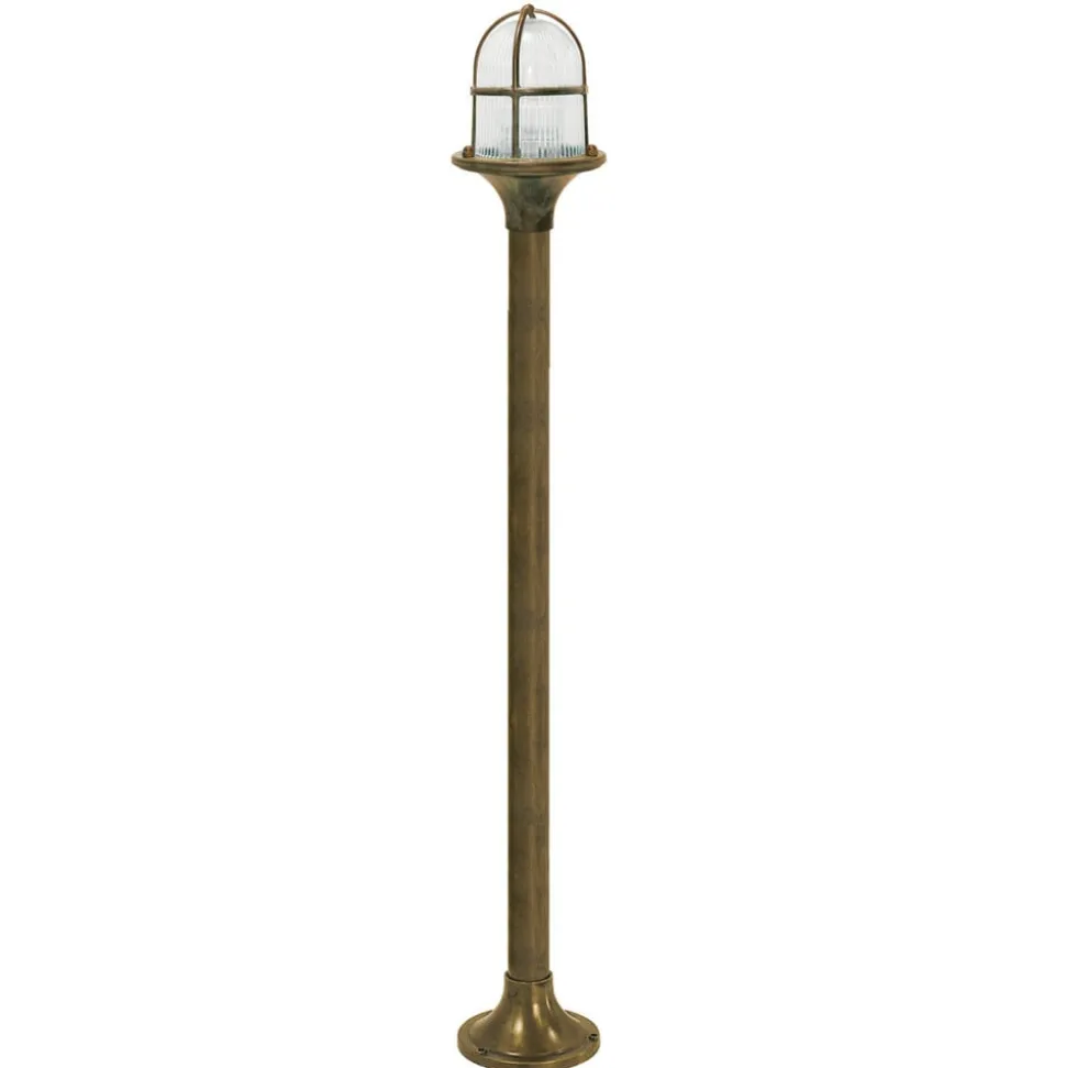 Enkel stibelysning Ocean i messingStibelysningen Ocean giver solid belysning til udendørsområdet. Messingrammen giver høj stabilitet og god støtte til det store glas. Det er gennemsigtigt og lader lyset slippe godt igennem, hvilket gør armaturet velegnet som stibelysning. Som navnet antyder, minder designet om lamper fra den maritime sektor.