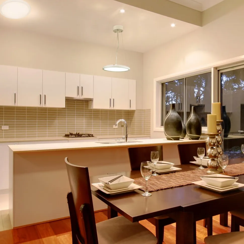 SylRadiance rund LED-loftlampe – generel belysning i store områder, dæmpbar via vægkontakt LED-loftlampen SylRadiance er en alsidig lyskilde til stuer og opholdsrum. Den er lavet af PMMA-plast i et neutralt design – rund, flad og hvid. Den integrerede LED-lyskilde giver et varmhvidt lys, der fungerer som almenbelysning i store områder og også skaber en glorieeffekt, der visuelt adskiller armaturet fra baggrunden. Stænkvandsbeskyttelsen muliggør også brug i fugtige rum og badeværelser – Justerbar via vægkontakt i tre effektniveauer: 100 % / 50 % / 10 % – Ophængssæt til brug som pendellampe fås separat – Kapslingsgrad: IP54 (loftsmonteret) / IP20 (pendelmonteret)