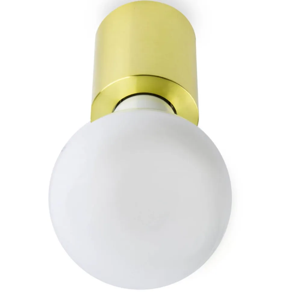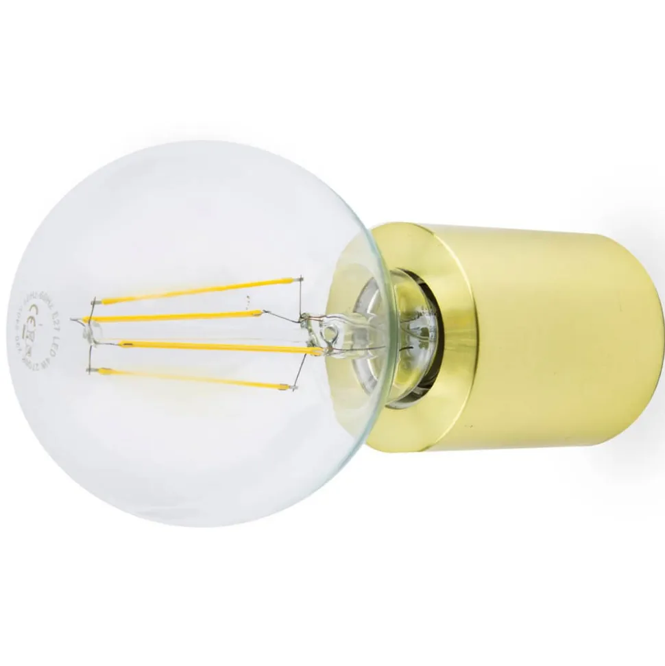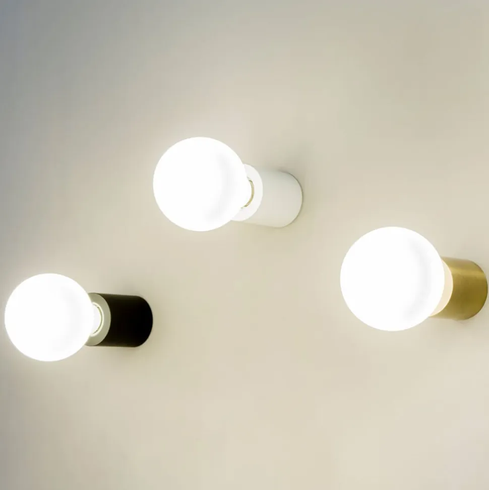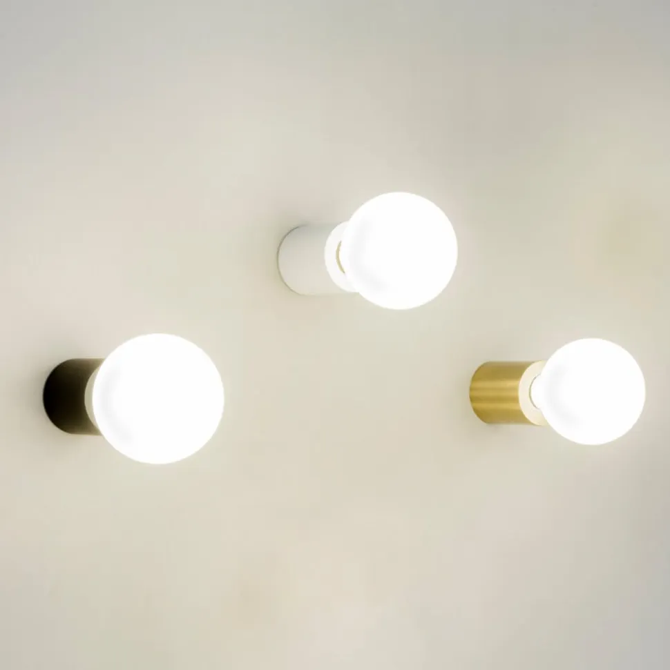 En simpel fatning af metal, hvori der er indsat en lampe med en E27- fatning – det vil sige væglampen Ten, som kan skiftes optisk ved at vælge lampen. Som på billedet kan en globuslampe med klart glas bruges, men LED-lamper med satinoverflade er også mulige eller lamper i andre former (se tilbehør). Lampen kan også bruges som loftlampe i små rum, eller når flere er installeret.