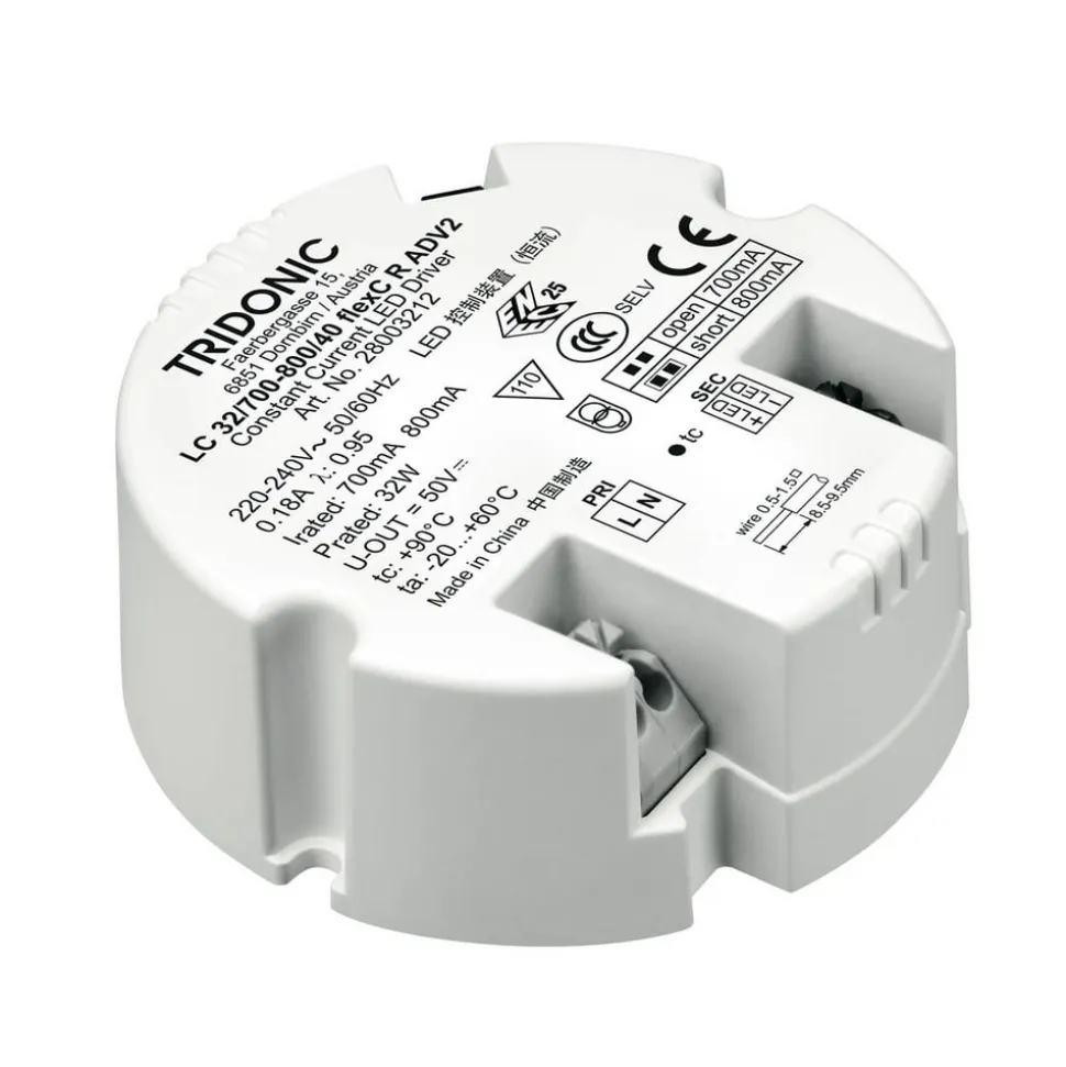Rund konstantstrøms LED-driver LC flexC R ADV2 IP20 fra TRIDONIC til montering i armaturer, udgangsstrøm kan vælges i to trin