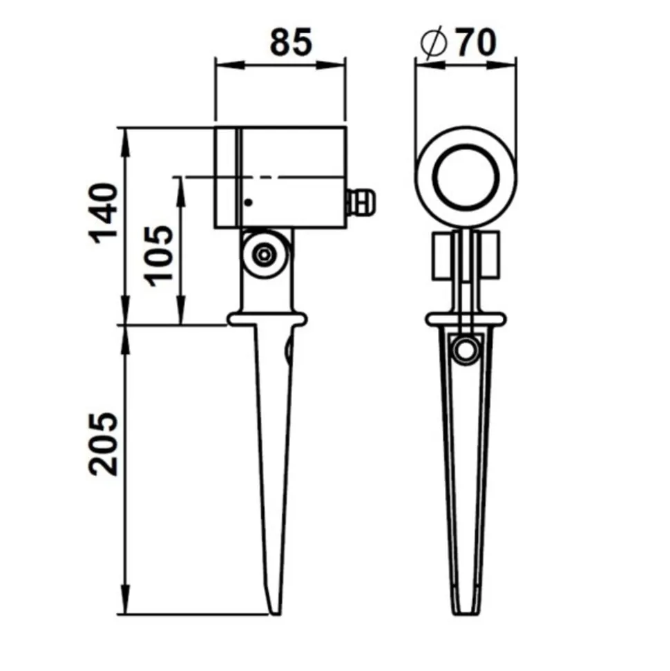 Praktisk 626 udendørs spotlampe med nyttigt jordspyd til fleksibel brug 626 udendørs spotlampen af trykstøbt aluminium er en ideel lyskilde til brug i haven til belysning af bygningsfacader. Den cylindriske spot er udstyret med et borosilikatglasdæksel og giver en lysfordeling af høj kvalitet. Et fastgjort jordspyd giver mulighed for fleksibel placering i jorden. Armaturet kan placeres ud fra forskellige aspekter. Hvis 626 placeres i udkanten af en prydbusk, kan skygger fra planten skabe en silhuetlignende scene på facaden. Den kan også installeres i et åbent område og belyse bygningsvæggen kraftigt. Et 2,5 meter langt kabel sørger for strømforsyningen. Spotlighten er ikke egnet til sparepærer – IP54 kapslingsgrad – Fremstillet i Tyskland