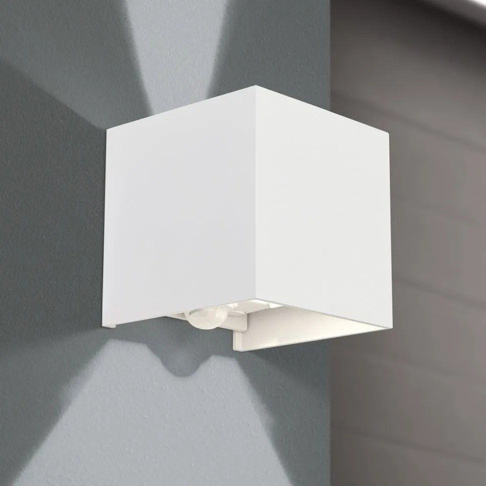 Udendørs væglampe Cube-S med sensor og up/downlight Cube-S forbedrer mange husindgange og facader med sit enkle, moderne design. Takket være kapslingsgraden IP54 er lampen ekstremt vejrbestandig og derfor beskyttet mod støv og vand. Det behagelige, varmhvide lys fra den udendørs væglampe sendes effektivt opad og nedad og aktiveres takket være den integrerede sensor kun, når der er brug for det. Sensordata: – Registreringsvinkel 150 grader – Rækkevidde 10 meter – 60 sekunders lysvarighed