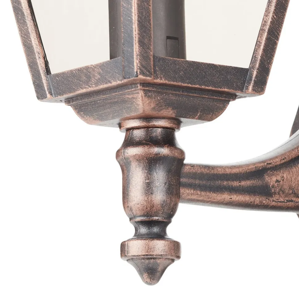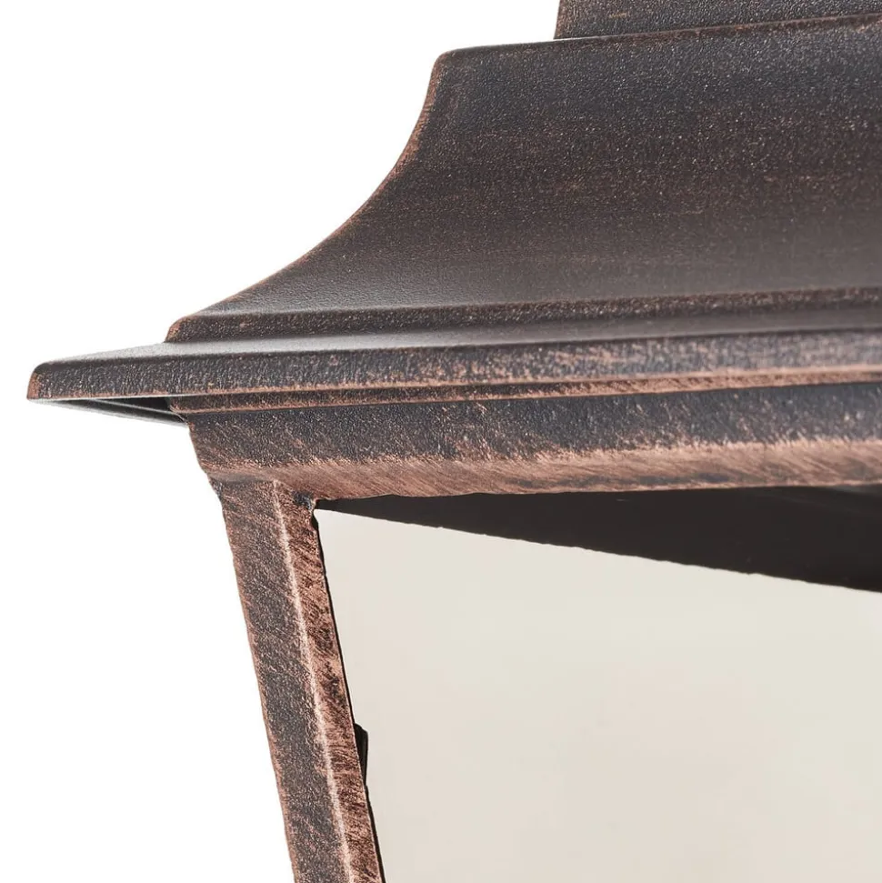 Kobberlooket giver Toulouse udendørs væglampe en klassisk charme Toulouse udendørs væglampe ser ud til at være modelleret efter tidligere tiders stil og giver udendørsarealer en helt særlig atmosfære. Den strukturerede ramme af pulverlakeret aluminium i et antikt kobberlook gør også lampen til et attraktivt blikfang. Med en IP43-beskyttelsesgrad er Toulouse optimalt beskyttet mod indtrængning af fremmedlegemer fra 2,5 mm og vandsprøjt. Denne udendørs væglampe er også kompatibel med energisparepærer, hvilket gør den endnu mere attraktiv.