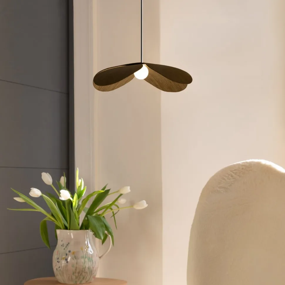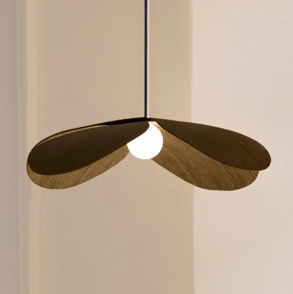 Lampens skærm er lavet af egetræsfinér. Dette danner kronbladene på forglemmigejen. I midten af “blomsten” er der en kugleformet diffusor af plast, der spreder lyset i rummet uden at blænde. Pendellampen kan hænge enkeltvis eller flere ved siden af hinanden, så f.eks. et stort spisebord eller en bar kan belyses.