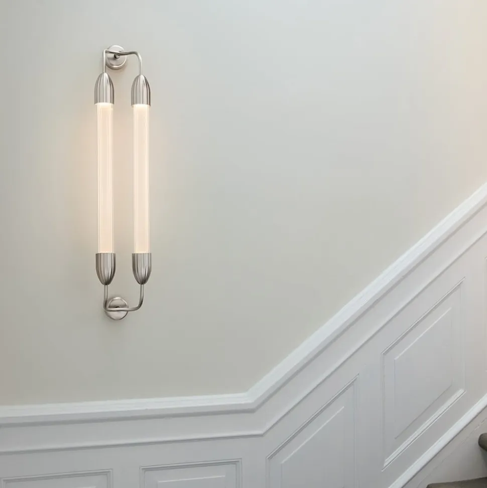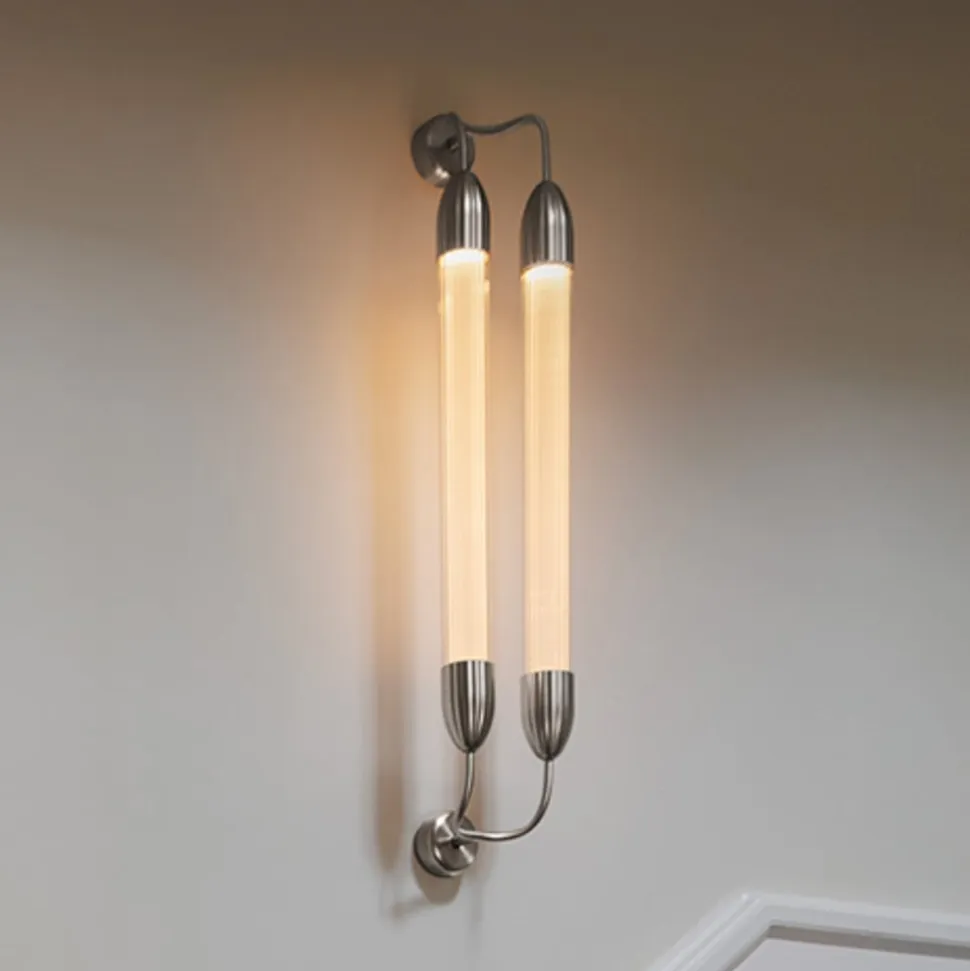 Lemon Squeeze væglampe, 2 lyskilder med GU10 fatninger Den 2 lyskilder Lemon Squeeze væglampe fremkalder nostalgiske følelser og udstråler samtidig moderne elegance. Den er lavet af stål og ekstruderet glas med karakteristiske bølger. Inde i de to parallelle glaskolber er der diffusorrør, som giver en blød og jævn belysning. Armaturserien Lemon Squeeze er designet af Søren Ravn Christensen, designer og medstifter af det danske belysningsfirma UMAGE. Stuer, gange, soveværelser og mange andre områder kan oplyses med Lemon Squeeze væglampen og skabe en rolig og harmonisk atmosfære i rummet. Med sin yndefulde æstetik og smukke lyseffekt passer væglampen ind i ethvert rum og giver en meget behagelig belysning, varme og raffinement til ethvert miljø. GU10-fatningerne i det rørformede glas kan udstyres med LED-pærer på op til 15 W.