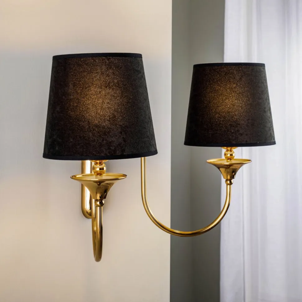 Væglampe Baranio med stofskærme kombinerer klassisk design med moderne funktionalitet. Fremstillet af højkvalitets messing og eksklusivt stof passer den harmonisk ind i forskellige boligområder som stuen, soveværelset, entreen og spisestuen. Konstruktionen med 2 lyskilder sikrer en jævn og behagelig belysning, der skaber både hyggelige og inspirerende atmosfærer.