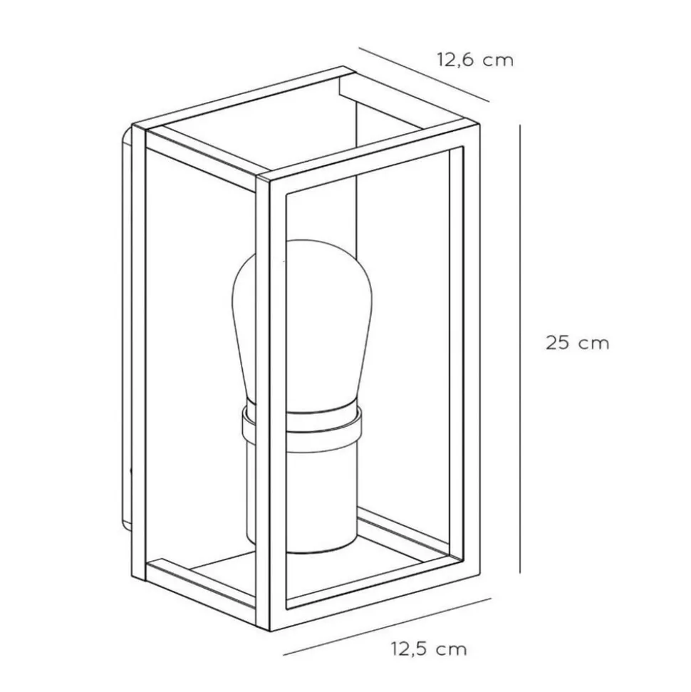 Væglampen Carlyn er lavet som en væglygte. Den har et kabinet af aluminium, der er åbent på fem sider. I midten sidder holderen med lyskilden, der indsættes således at pæren peger opad.