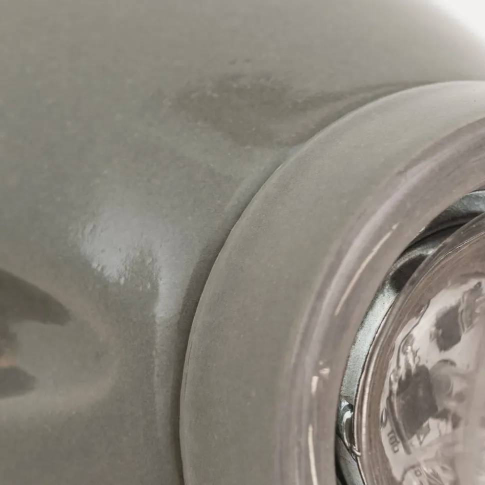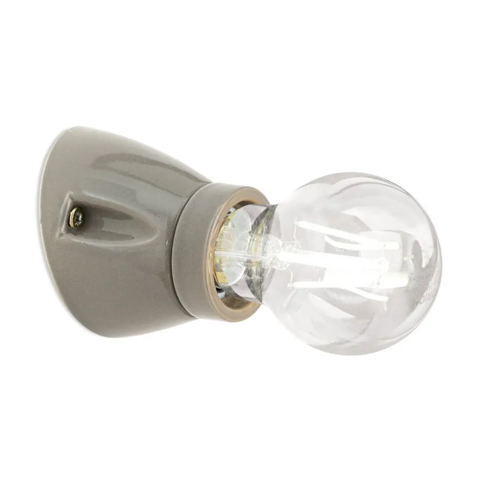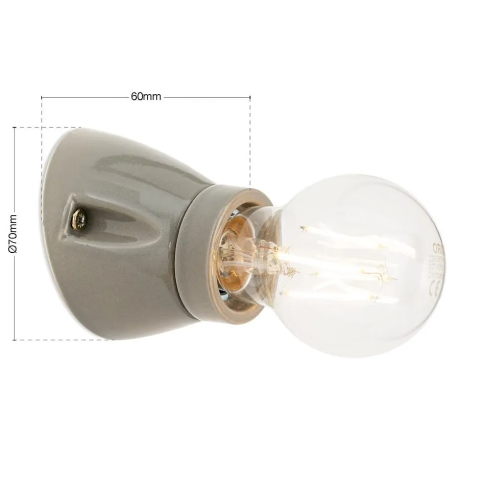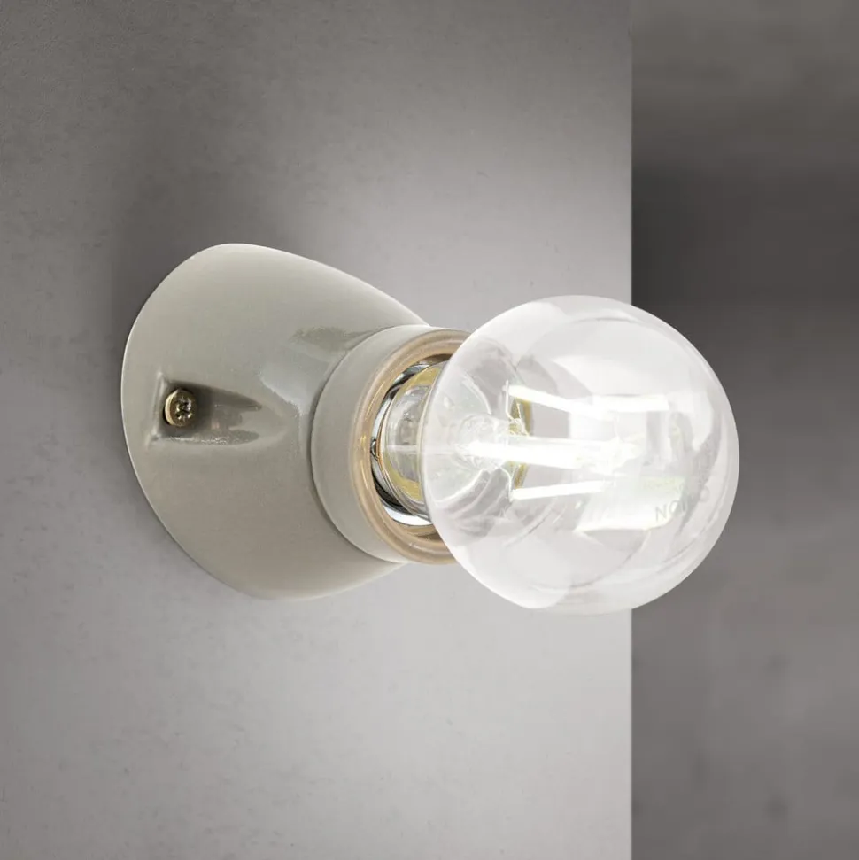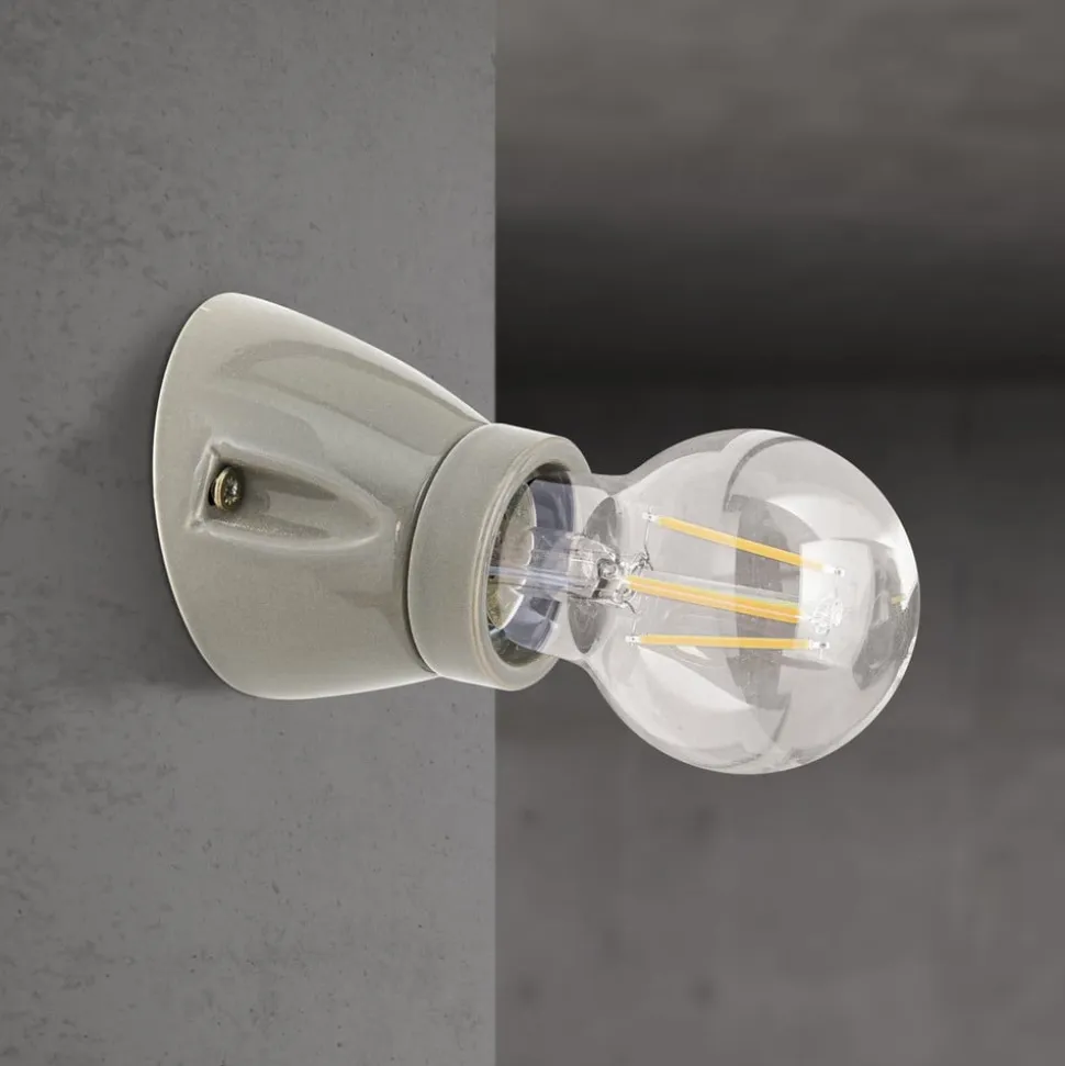 Frost keramisk fatningslampe – til væg- eller loftsmontering (vinkel: 45°) Frost-væglampen er et lille, men desto mere effektivt belysningstilbehør til interiør i retrostil. Den består ganske enkelt af et vægbeslag af glaseret keramik, hvori der er indbygget en E27-fatning. Der kan bruges lyskilder (herunder LED) med en maksimal effekt på 60 watt. Det ser bedst ud, når der bruges retrofit-lamper i et rustikt design, som vist på billedet. Lyskilden er ikke inkluderet i leveringen. Egnede lamper fås som tilbehør – eksternt dæmpbar
