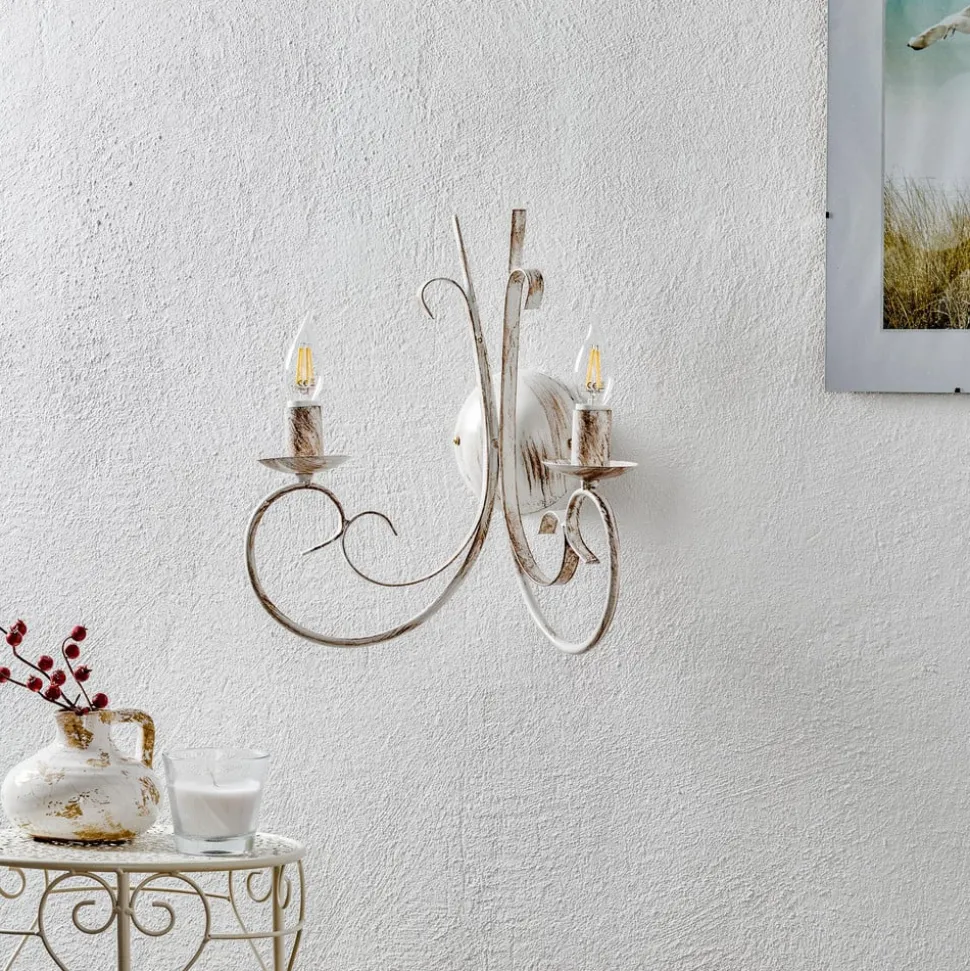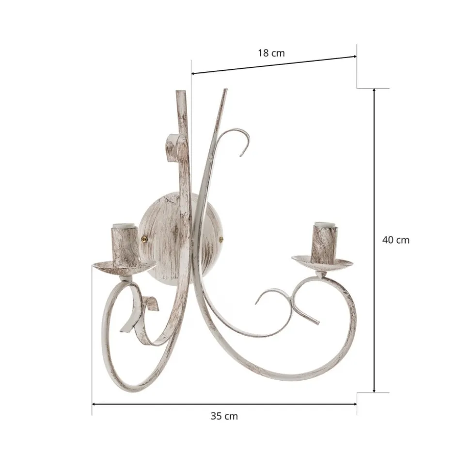 Væglampe Pompei med 2 lyskilder i antik hvid kombinerer rustik charme med funktionel alsidighed. Den er fremstillet af højkvalitets jern og passer perfekt ind i forskellige rumkoncepter, hvad enten det er i stuen, soveværelset eller spisestuen. Den stilfulde landlige look giver ethvert rum et særligt præg og skaber en indbydende atmosfære.