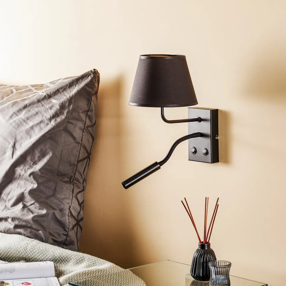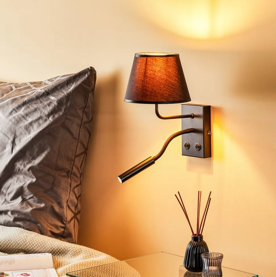 Væglampe Soho forener moderne design med praktisk funktionalitet og bliver dermed et stilfuldt highlight i ethvert rum. Den er fremstillet af højkvalitetsmetal og eksklusivt stof og imponerer med sin koniske form og den elegante farvekombination af sort og guld. Denne lampe er ikke kun et blikfang, men har også en integreret læselampe, der giver målrettet belysning og dermed er ideel til stuen og soveværelset.