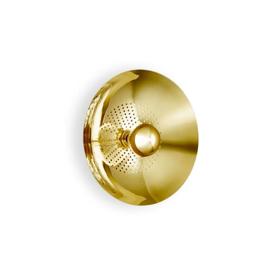 Wanted væglampe med perforeret skærm og stik Wanted væglampen er en elegant lampe med stor effekt, da den perforerede, guldfarvede skærm gør lyset levende. Den kan bruges mange steder og passer ind i både klassiske og moderne hjem. Den er også udstyret med stik og afbryder (tænd/sluk) på kablet, så den ikke skal tilsluttes væggen. Fatningen til en E27-pære (medfølger ikke) er placeret i midten. For det helt rigtige look anbefaler vi en globepære med guldfarvet spejlhoved og en diameter på 8 cm (se tilbehør). Wanted kommer fra DESIGN BY US og er et iøjnefaldende designobjekt, selv når den er slukket.