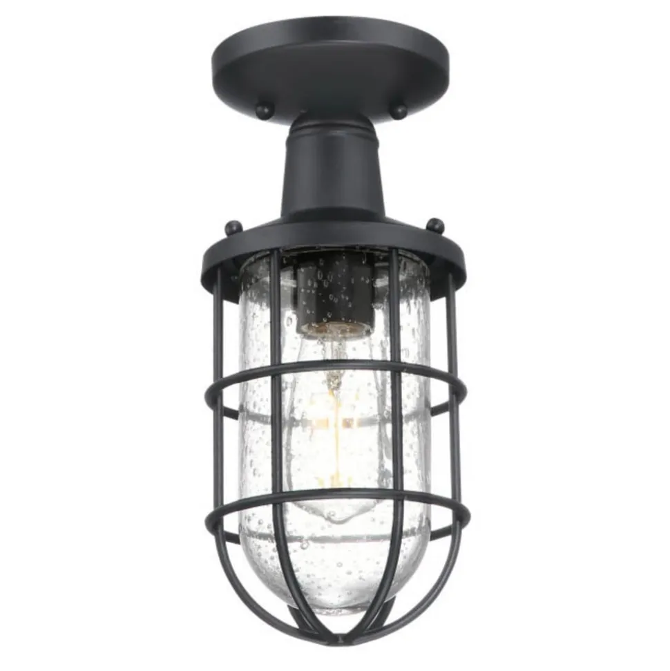 Burformet Crestview udendørs loftslampe af stål og mundblæst antikglas Det robuste hus på Crestview udendørs loftslampe er lavet af stål med en struktureret overflade i sort og har form som et bur. Indeni er der en lampeskærm af glas med fine luftindeslutninger. Det antikke glas skaber et let diffust lys og er også meget attraktivt at se på tæt hold, når denne loftslampe ikke er tændt. Crestview er meget velegnet til udendørs brug, for eksempel over indgangen, samt i kældre, da den er beskyttet mod stænkvand (IP44). Man kan f.eks. bruge glødepærer i den mundblæste glasskærm, og man kan bruge tonede pærer for at skabe en særlig behagelig atmosfære.