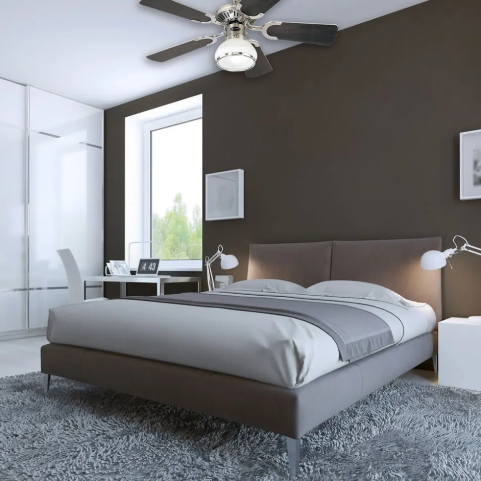 Eksklusiv Princess Radiance II loftventilator med et elegant design Den eksklusive Princess Radiance II loftventilator er dygtigt designet. Med sin innovative lyskilde giver det integrerede lys også et behageligt lys i rummet. Lyset af buet glas danner en æstetisk kombination af materialer af høj kvalitet med den kunstnerisk designede kromindfatning. Pærerne og en fjernbetjening kan købes som tilbehør. Funktioner Denne loftventilator har mulighed for at køre frem og tilbage, som kan varieres ved hjælp af en kontakt, der er indbygget i huset. På den måde afkøles luften optimalt om sommeren, og om vinteren fordeles luften jævnt i rummet af lamellerne. Effekten og hastigheden reguleres hver i tre trin. Ventilatoren kan installeres med eller uden den loftstang, der er inkluderet i leveringen. Bladene er malet sorte på den ene side og hvide på den anden, så de kan vendes til den ønskede farve under installationen. Tekniske data Effekt pr. hastighed: – 33,8 watt ved 125 o/min – 36,2 watt ved 175 o/min – 43,5 watt ved 235 o/min