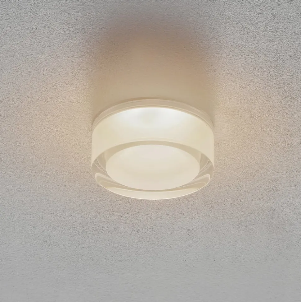 Rund indbygget loftlampe med LED Mirbi 1.0 – dæmpbar Denne indbyggede loftlampe Mirbi 1.0 er også designet til brug i badeværelser og andre rum, hvor der er fugt, takket være kapslingsgraden IP44 (beskyttelse mod stænkvand). Den moderne, delvist klare og delvist opale plastskærm, som udsender varmhvidt lys hele vejen rundt, har en særlig dekorativ effekt. En indbygget loftslampe, der kan harmonere med mange indretningsstile. Lysets intensitet kan reguleres ved hjælp af en ekstern dæmper. – Lofttykkelse: 2-25 mm – meget god farvegengivelse