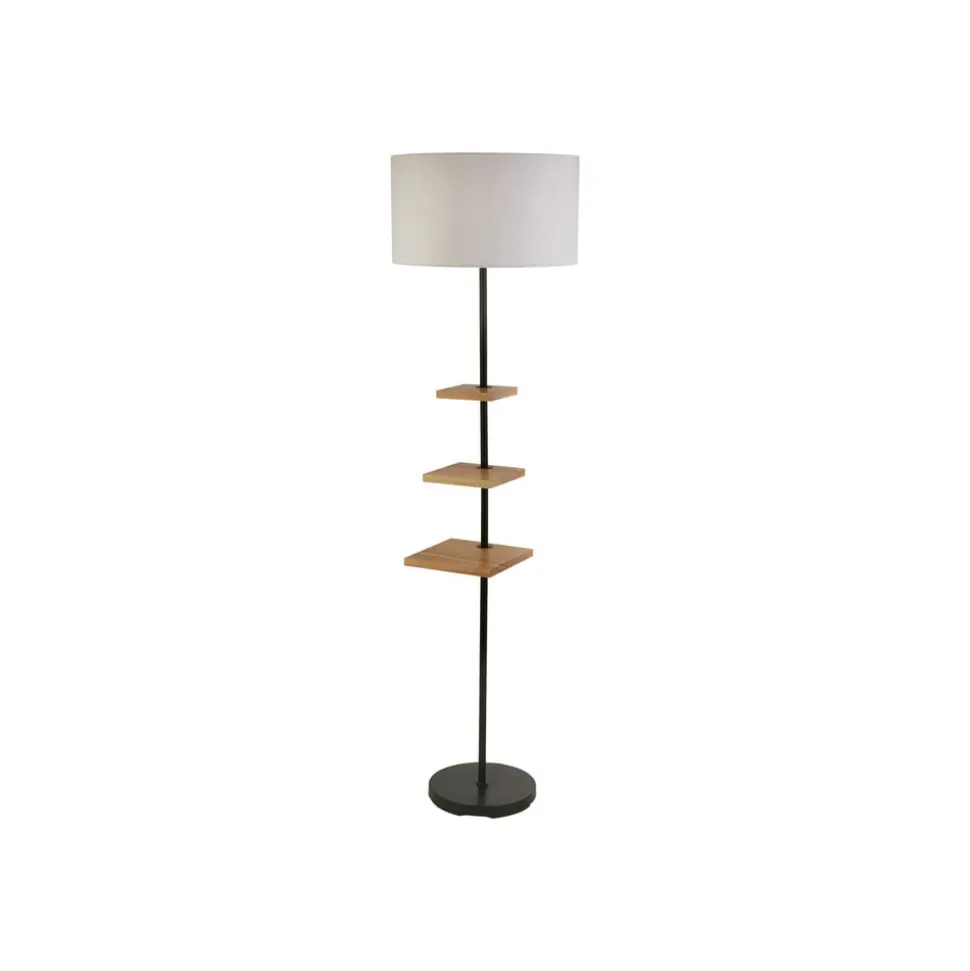 X Norfolk stålgulvlampe med tre træhylder og stofskærm X Norfolk gulvlampe er udstyret med tre træhylder i forskellige størrelser, som hver kan belastes med op til 0,5 kg, og fungerer som et unikt og udtryksfuldt element i enhver stue. Med sin trommeskærm i gråt stof udsender denne hyldegulvlampe et varmt og indbydende lys i ethvert rum. Indersiden af skærmen er hvid, hvilket sikrer en særlig god refleksion og fordeling af lyset. En fodkontakt (tænd/sluk) er integreret i stikket. X Norfolk har plads til en frit valgbar E27-pære (medfølger ikke, se tilbehør).