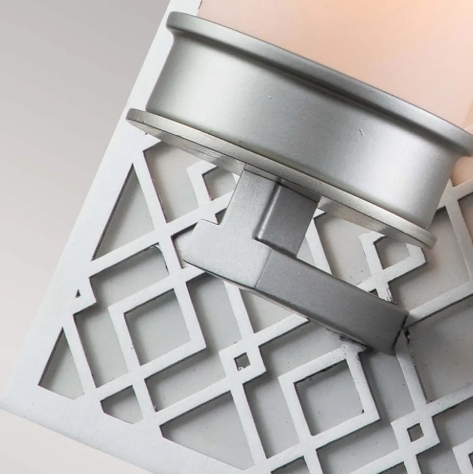 Ziggy væglampe med grafisk mønstret vægelement Ziggy er en væglampe, der er et blikfang på enhver væg. Det sølvfarvede vægbeslag i lakeret metal er dekoreret med et grafisk mønster og giver lampen et sofistikeret look. En rørformet skærm af hvidt glas sidder på den sølvfarvede fatning, som er fastgjort til det lille beslag nederst på vægbeslaget, hvilket giver blændfrit lys og en behagelig atmosfære i rummet. Ziggy-væglampen er perfekt som en ekstra lyskilde i stuen eller som et stilfuldt højdepunkt i soveværelset – kan dæmpes udefra