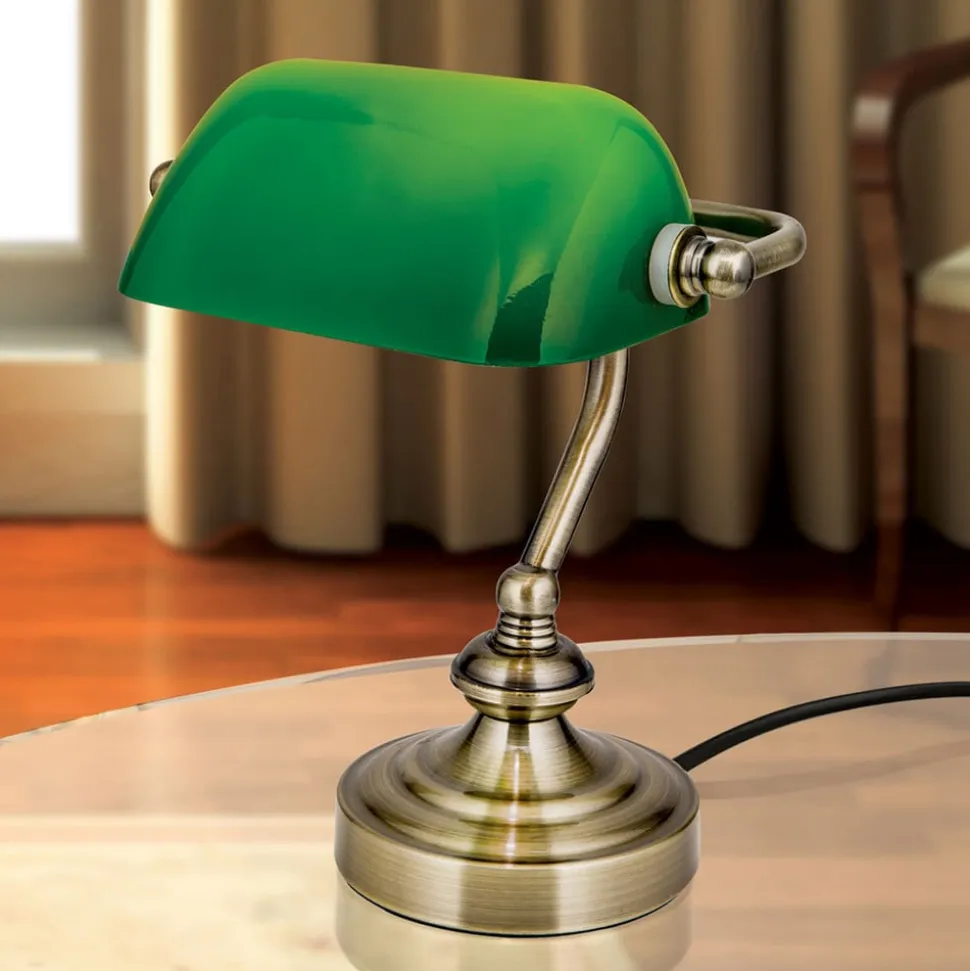 Den er klassikeren inden for skrivebordslamper, og den dag i dag, er den stadig populær: Bank bordlampen. For mindre skriveborde er banklampen Zora det perfekte valg, da den med en højde på blot 23 cm, ikke kræver meget plads. Når det kommer til kultfaktoren, er den dog lige så populær som de større modeller. Et stel i antik messing, og den typiske, svingbare glasskærm i iøjnefaldende grøn – typisk for banklamper – betyder det, at Zora med dette design uden tvivl kan stamme fra tiden med Art déco. I 1920’erne og 1930’erne fandt man utallige af disse skrivebordslamper på biblioteker, domstole, advokatfirmaer, banker og forretningskontorer.